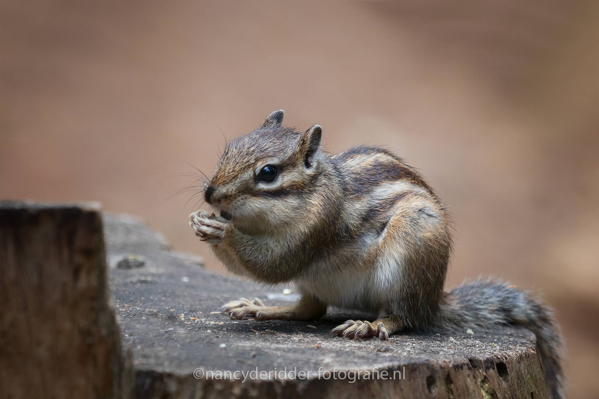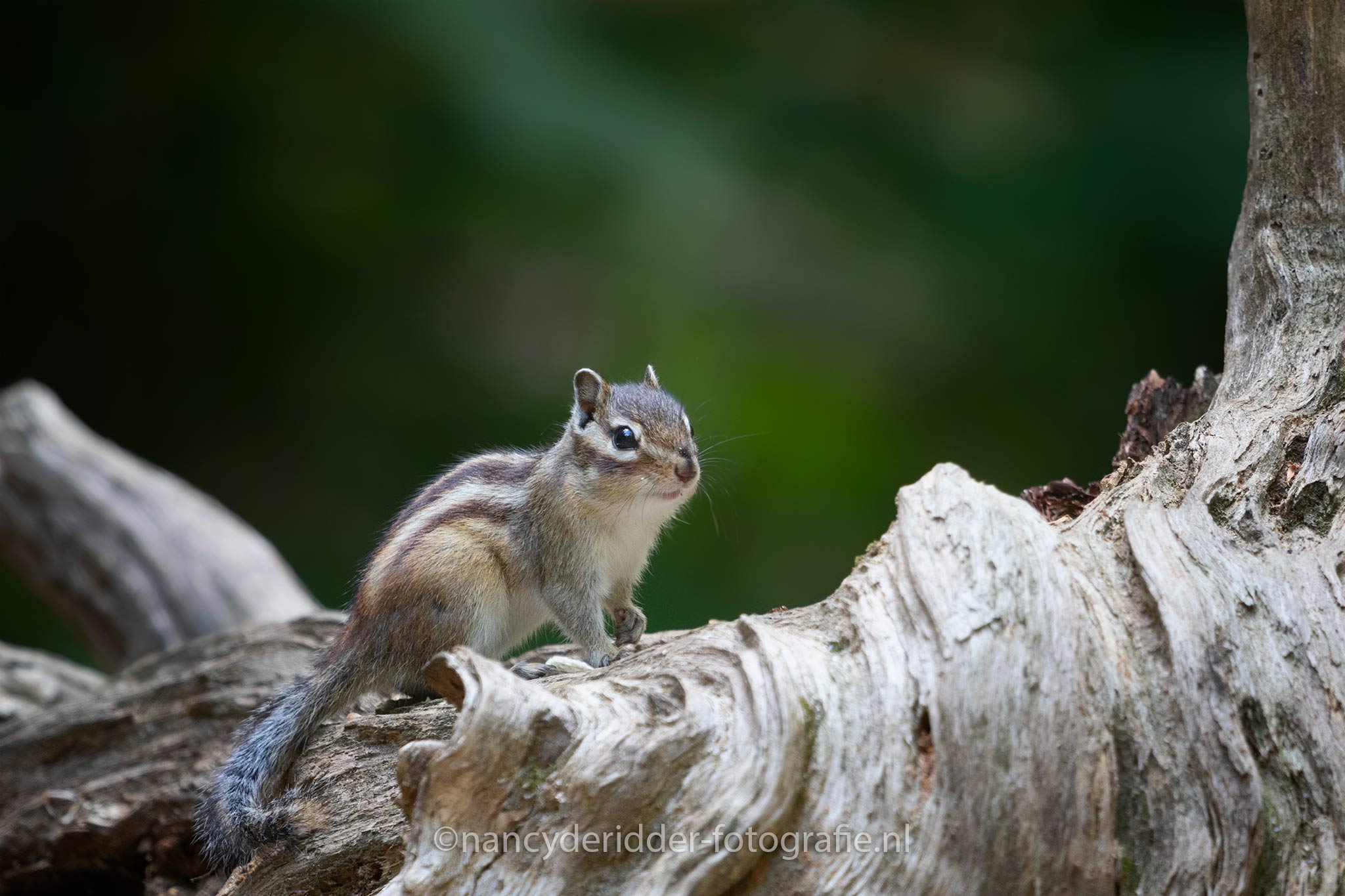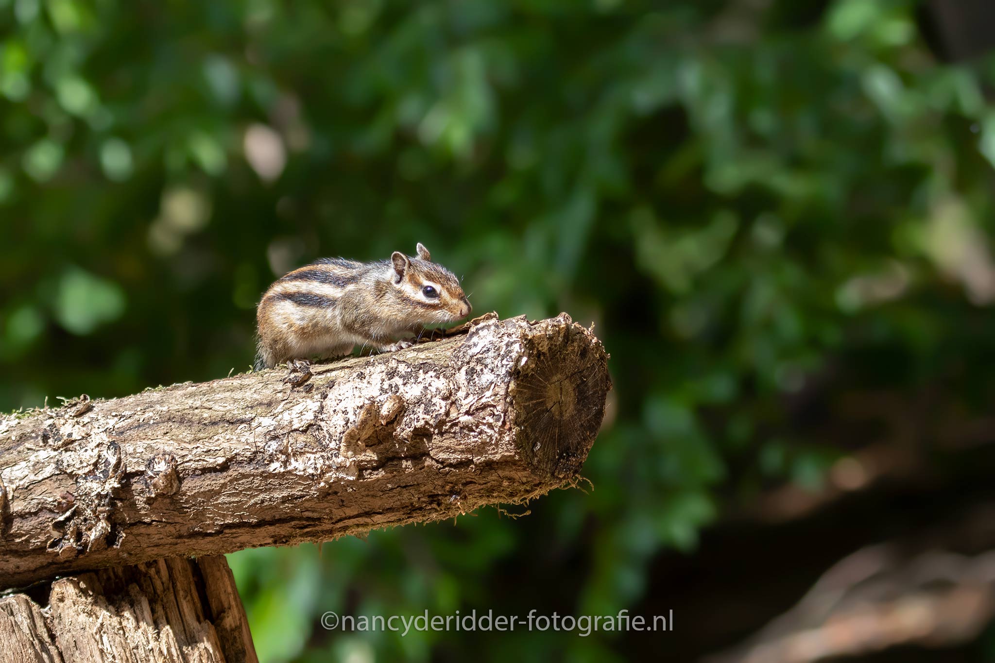 En ja hoor, aangekomen op de plek zagen we al snel de eerste grondeekhoorn wegschieten. Wat zijn ze klein!!!! Ik weet niet wat ik qua grootte had verwacht, maar zeker niet dit formaatje. Er lag een grote boomstam wat mooi dienst kon doen als bankje voor ons. Dus snel onze spullen uitpakken en afwachten.