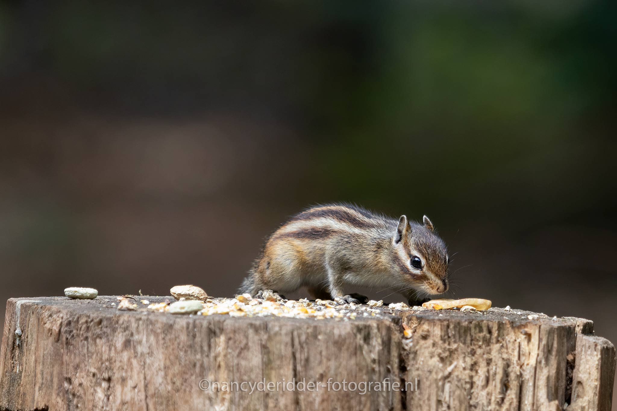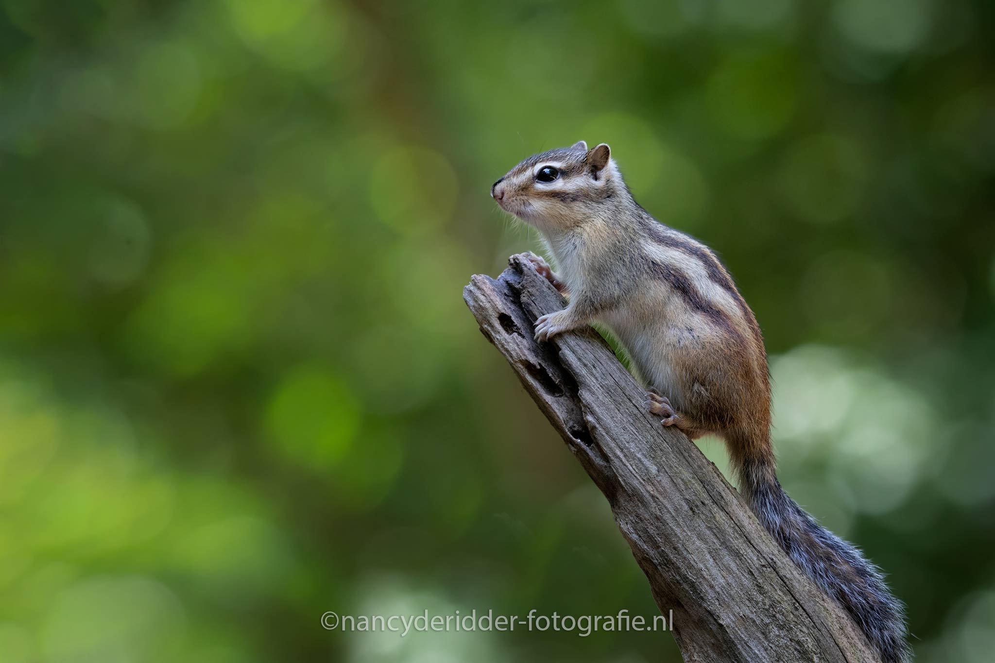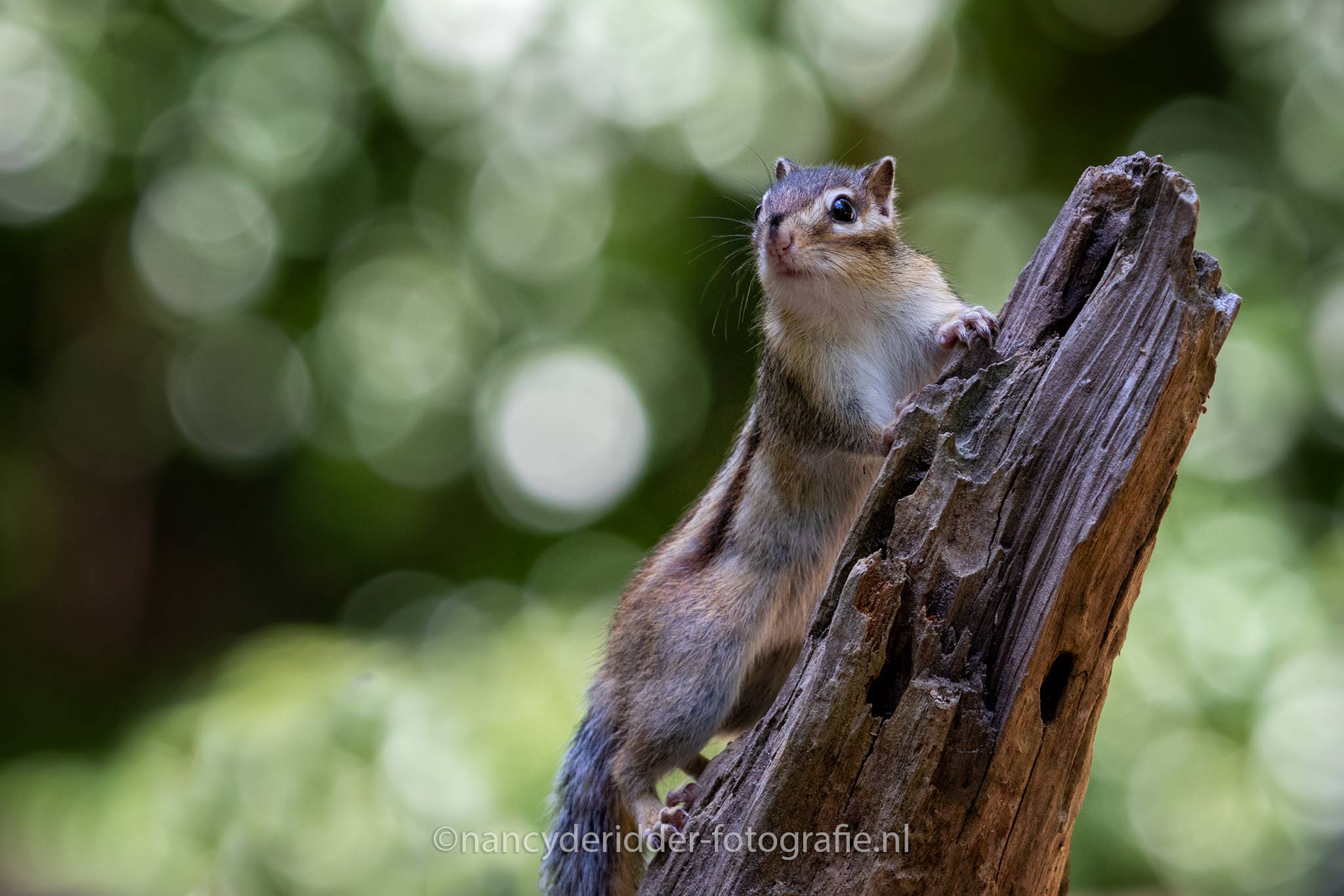 En ja hoor, aangekomen op de plek zagen we al snel de eerste grondeekhoorn wegschieten. Wat zijn ze klein!!!! Ik weet niet wat ik qua grootte had verwacht, maar zeker niet dit formaatje. Er lag een grote boomstam wat mooi dienst kon doen als bankje voor ons. Dus snel onze spullen uitpakken en afwachten.