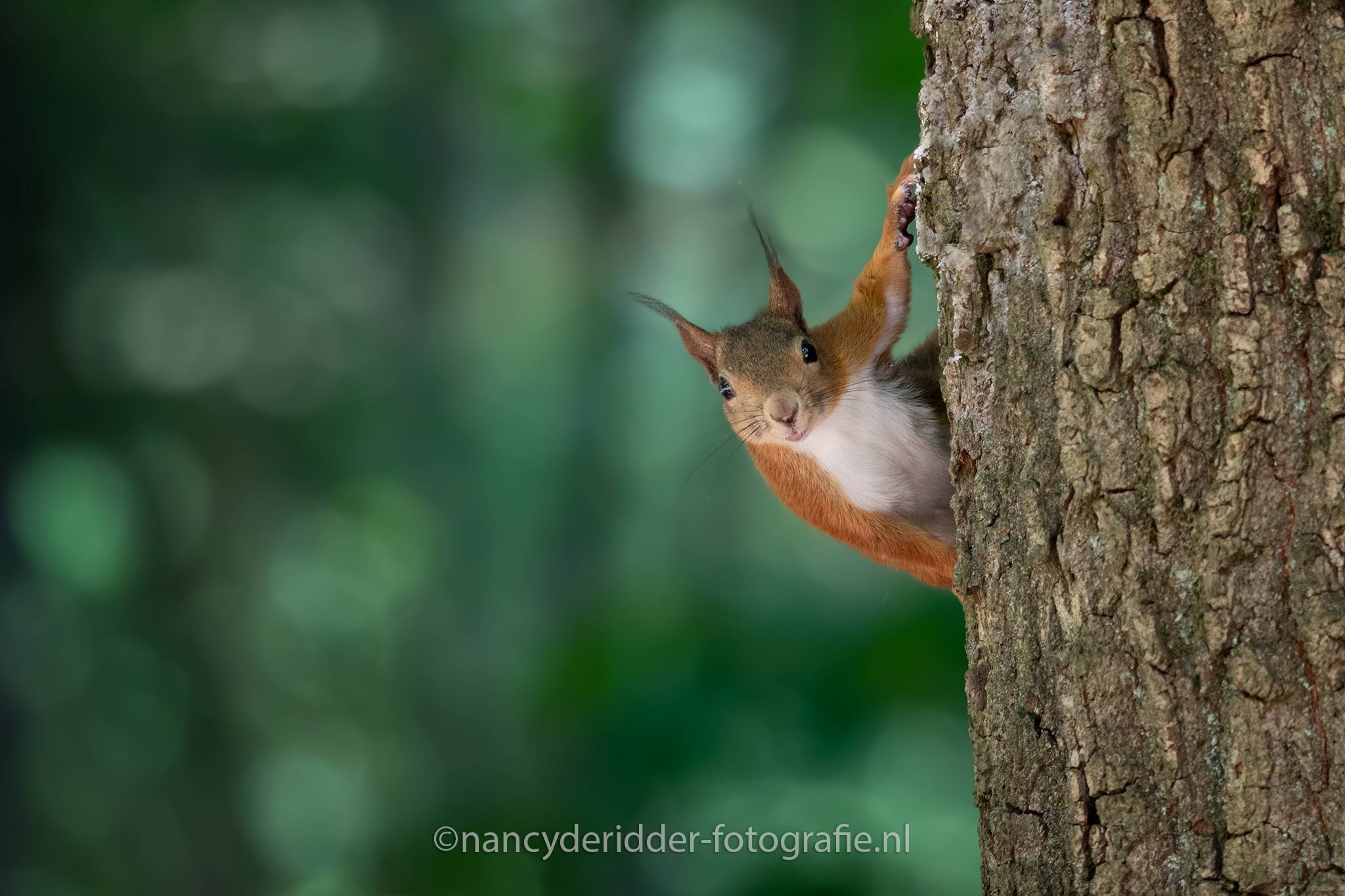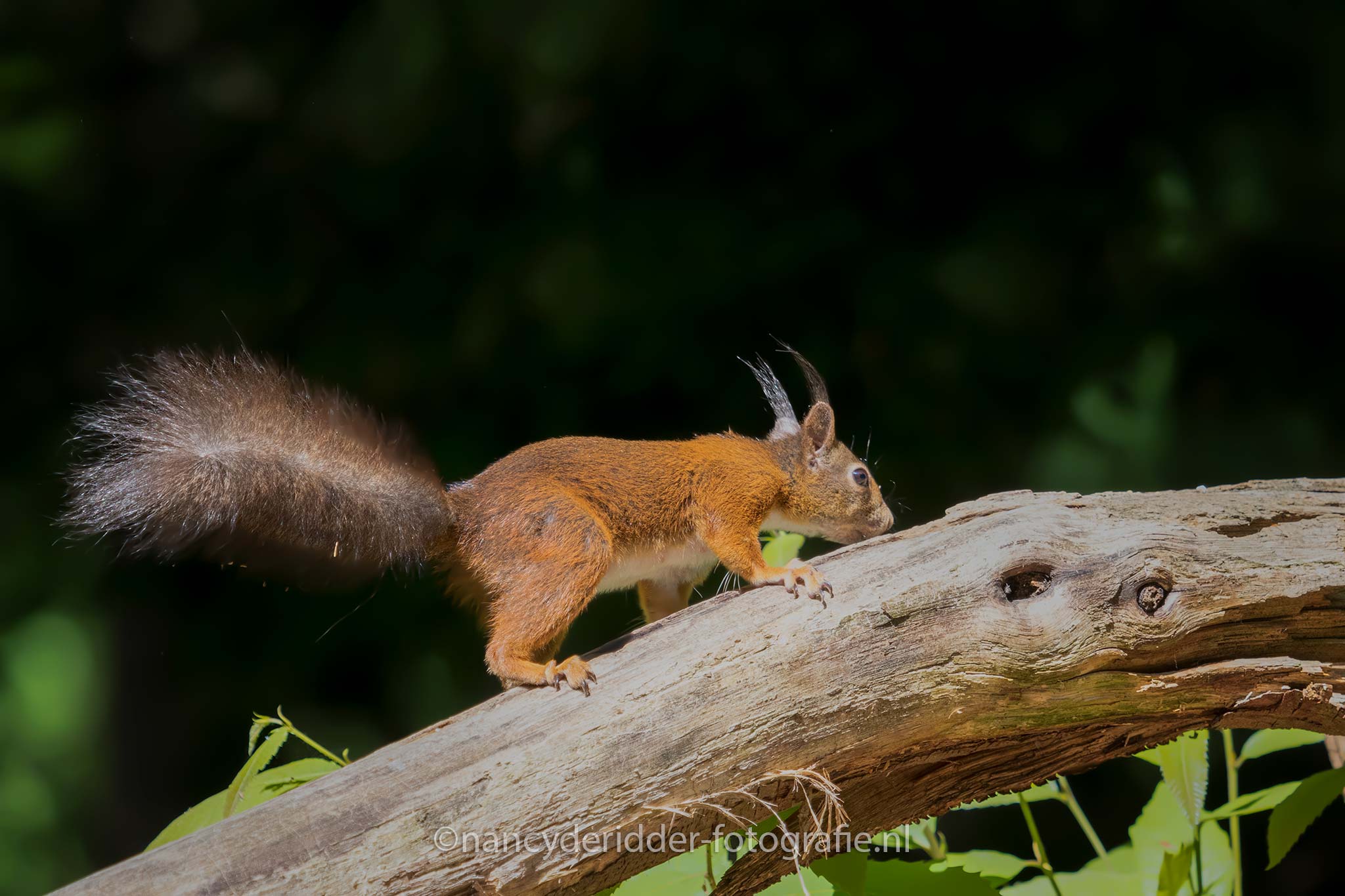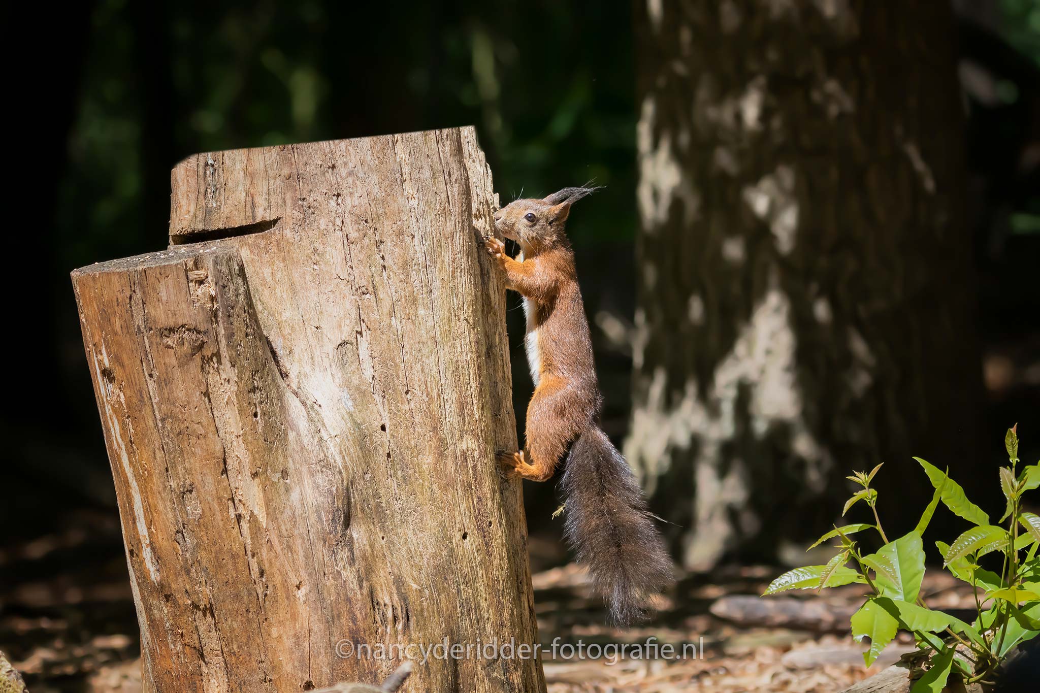 Zo plots als hij er was, zo snel was de rode eekhoorn ook weer verdwenen. Hij schoot de hoge bomen in alwaar hij lange tijd vanaf een tak naar beneden zat te gluren. Helaas voor ons kwam hij niet meer beneden om zich te laten bewonderen en op de foto te laten zetten, maar ja toch super leuk dat hij/zij zich even liet zien. Dit laatste gebeurt niet zo vaak heb ik mij laten vertellen.