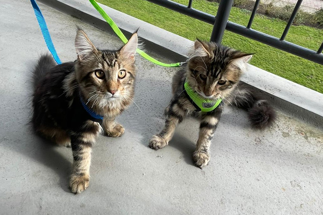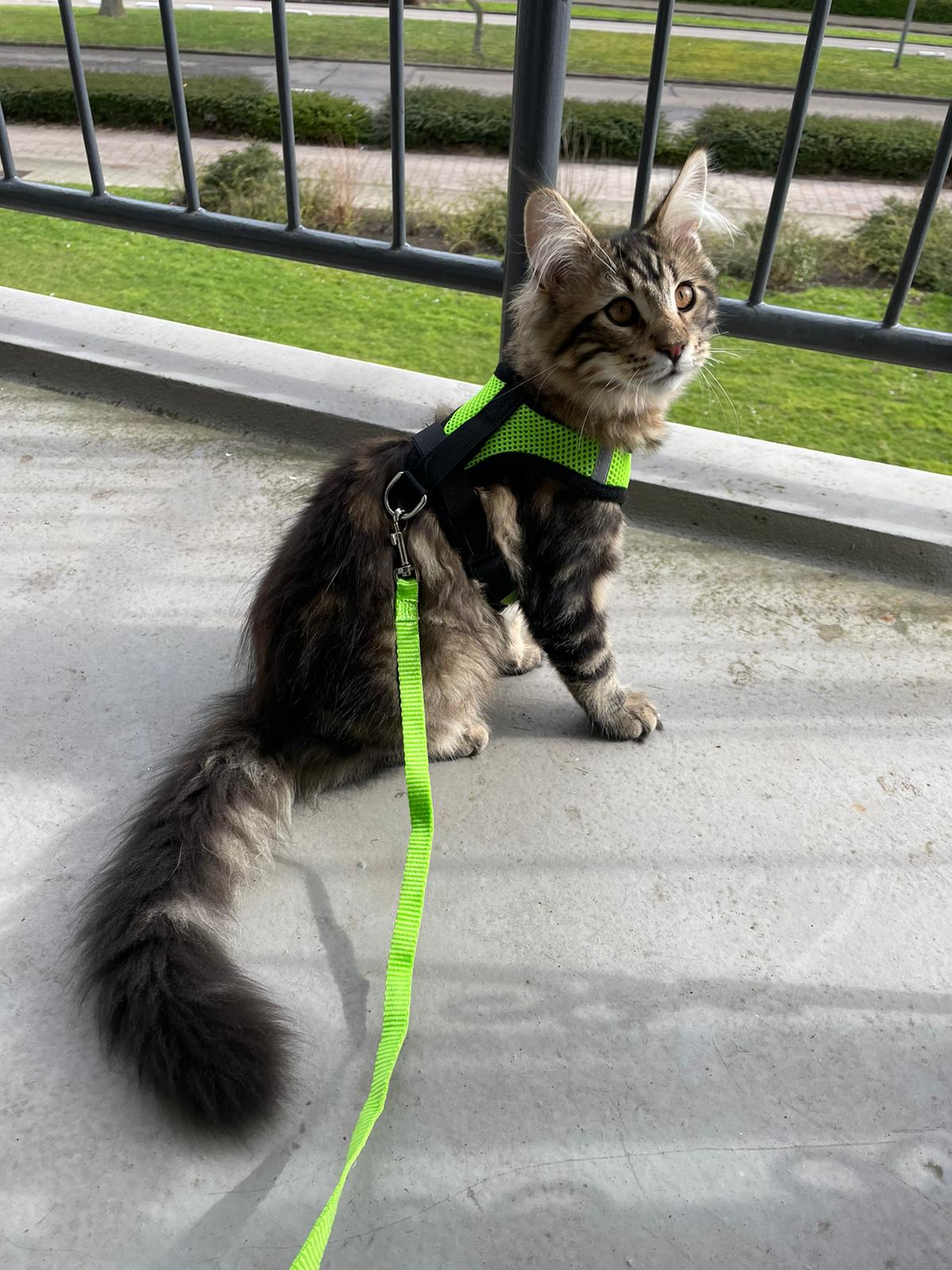 Helaas is mijn balkon nog niet Catproof en aangezien ik als de dood ben dat ze van 2 hoog naar beneden springen, mochten ze alleen mee onder begeleiding en met een tuigje om.