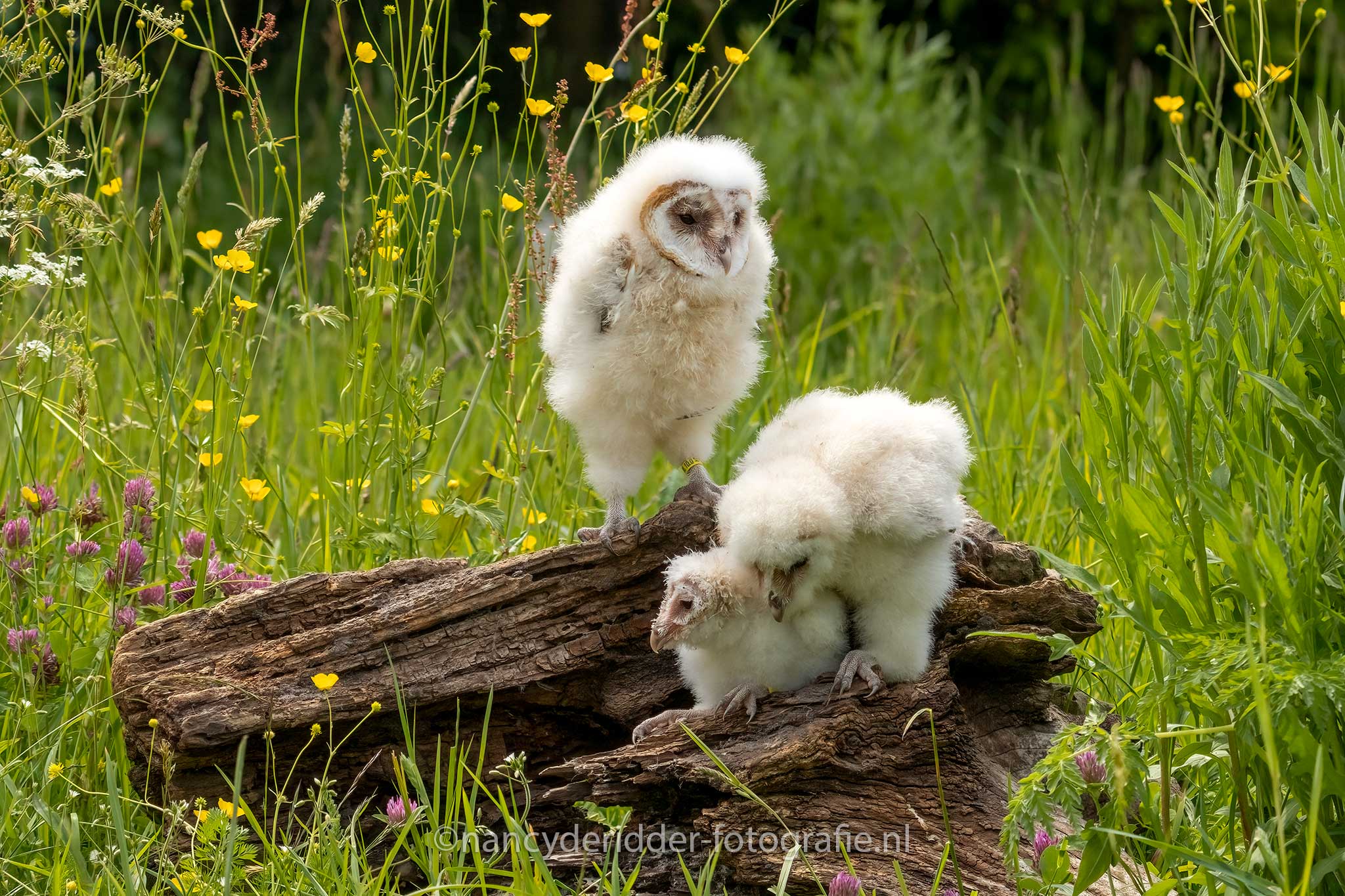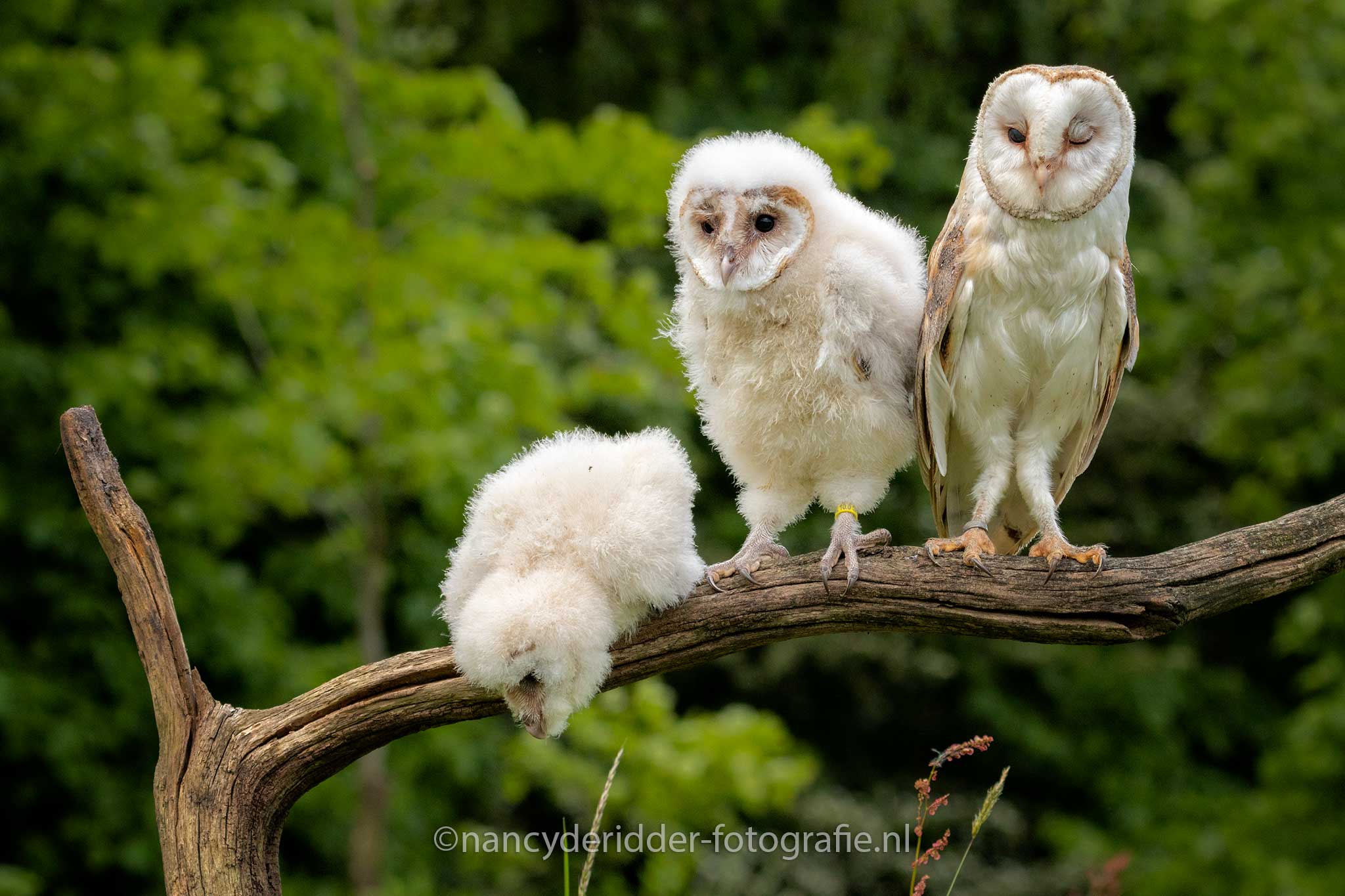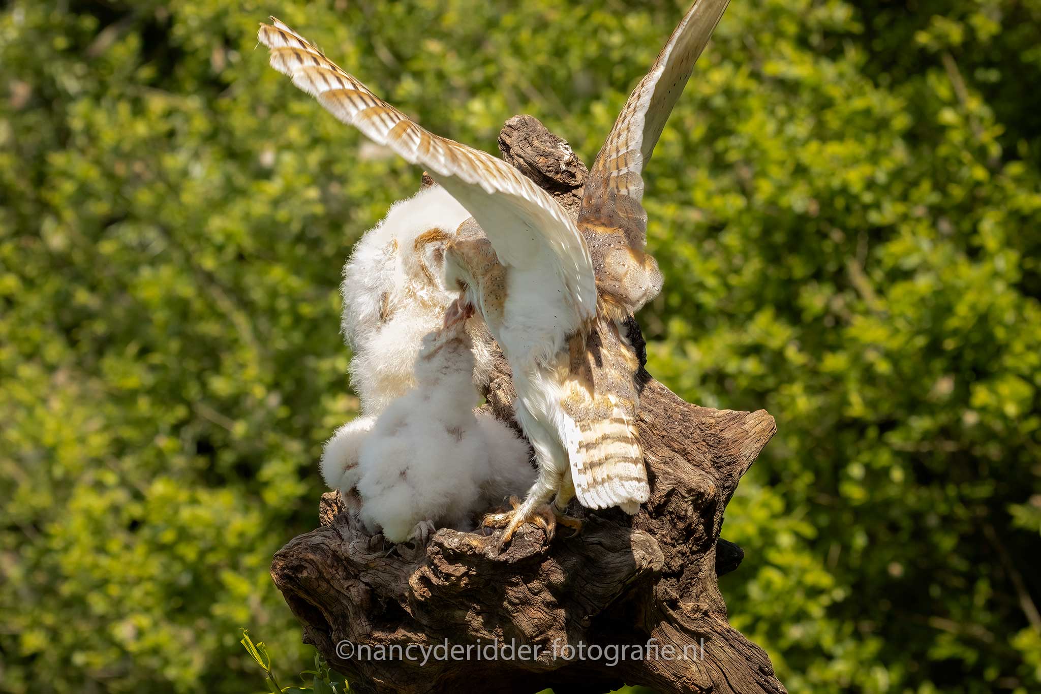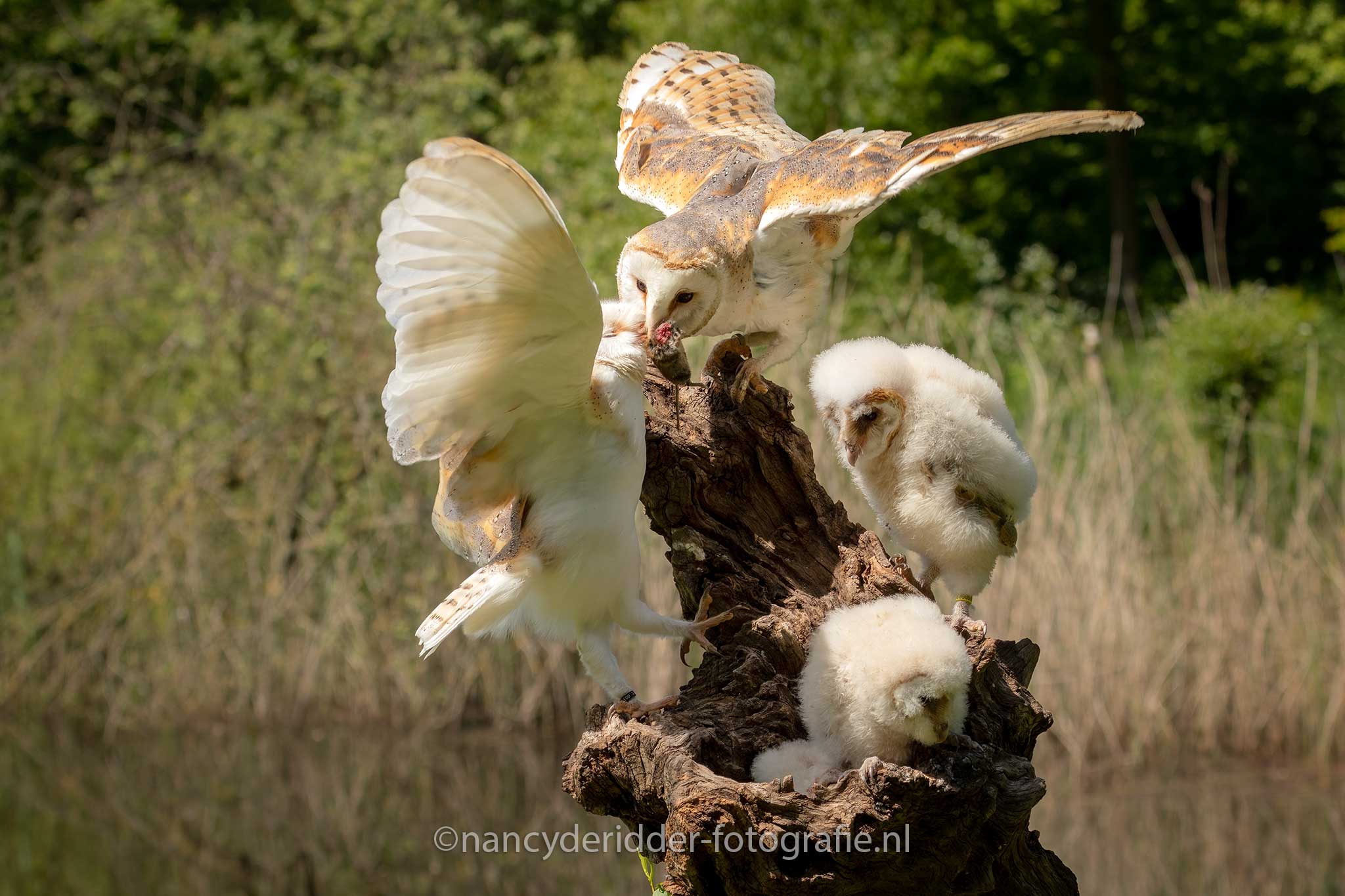 Aangekomen op de locatie stonden daar nog wat fotografen te wachten tot de poort open ging en wij naar binnen mochten. Een groepje van 8 fotografen is heel goed te doen en lopen we elkaar ook niet in de weg. Eenmaal binnen stond daar al gelijk een boomstronk waar dus 3 jonge kerkuilen op ons zaten te wachten, wat een schatjes zeg. Drie witte donzige pakketjes op een boomstronk, snel de camera uitpakken. Al snel kwam moeders erbij, want ja niemand laat zijn kinderen alleen natuurlijk toch?