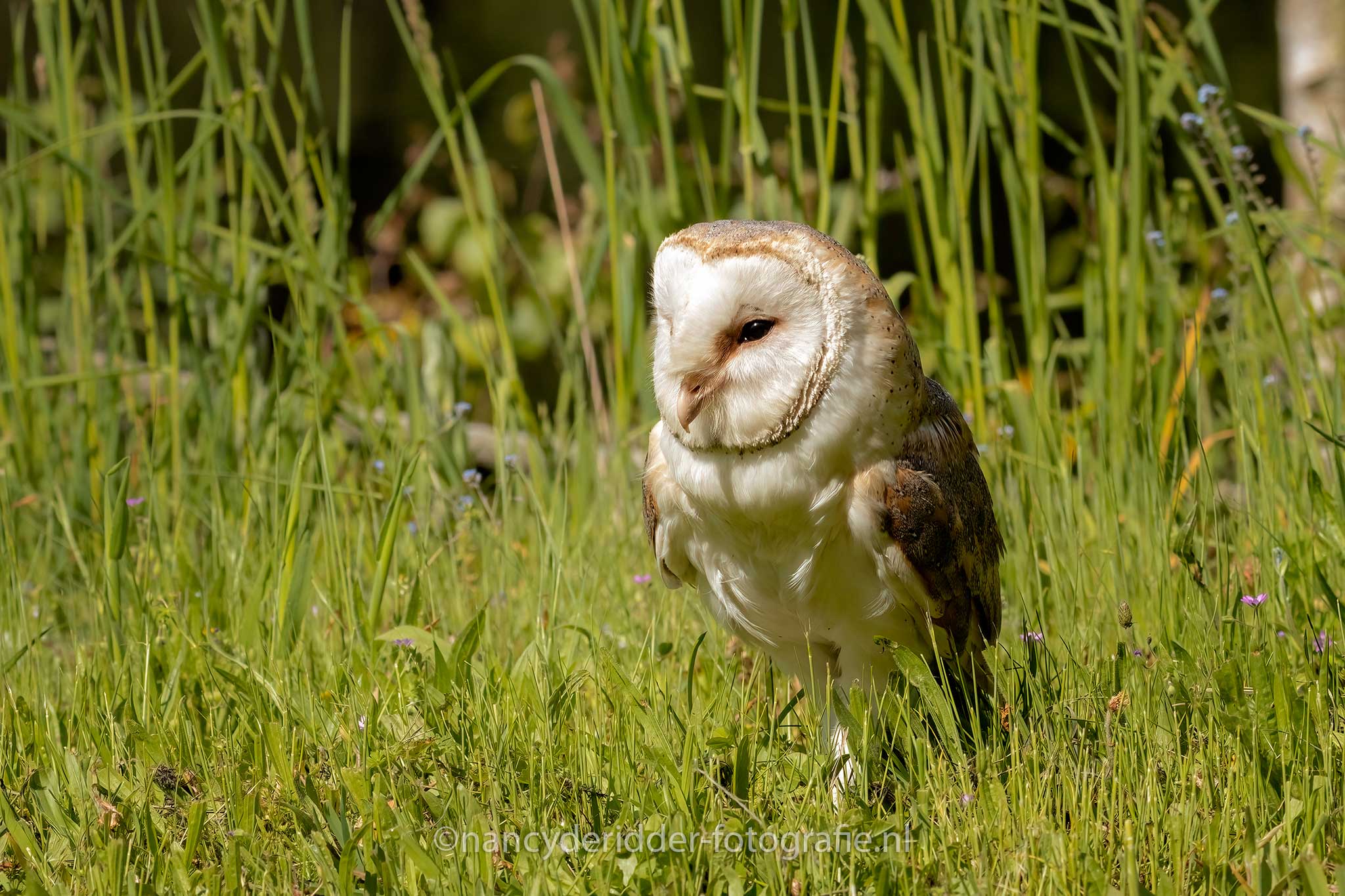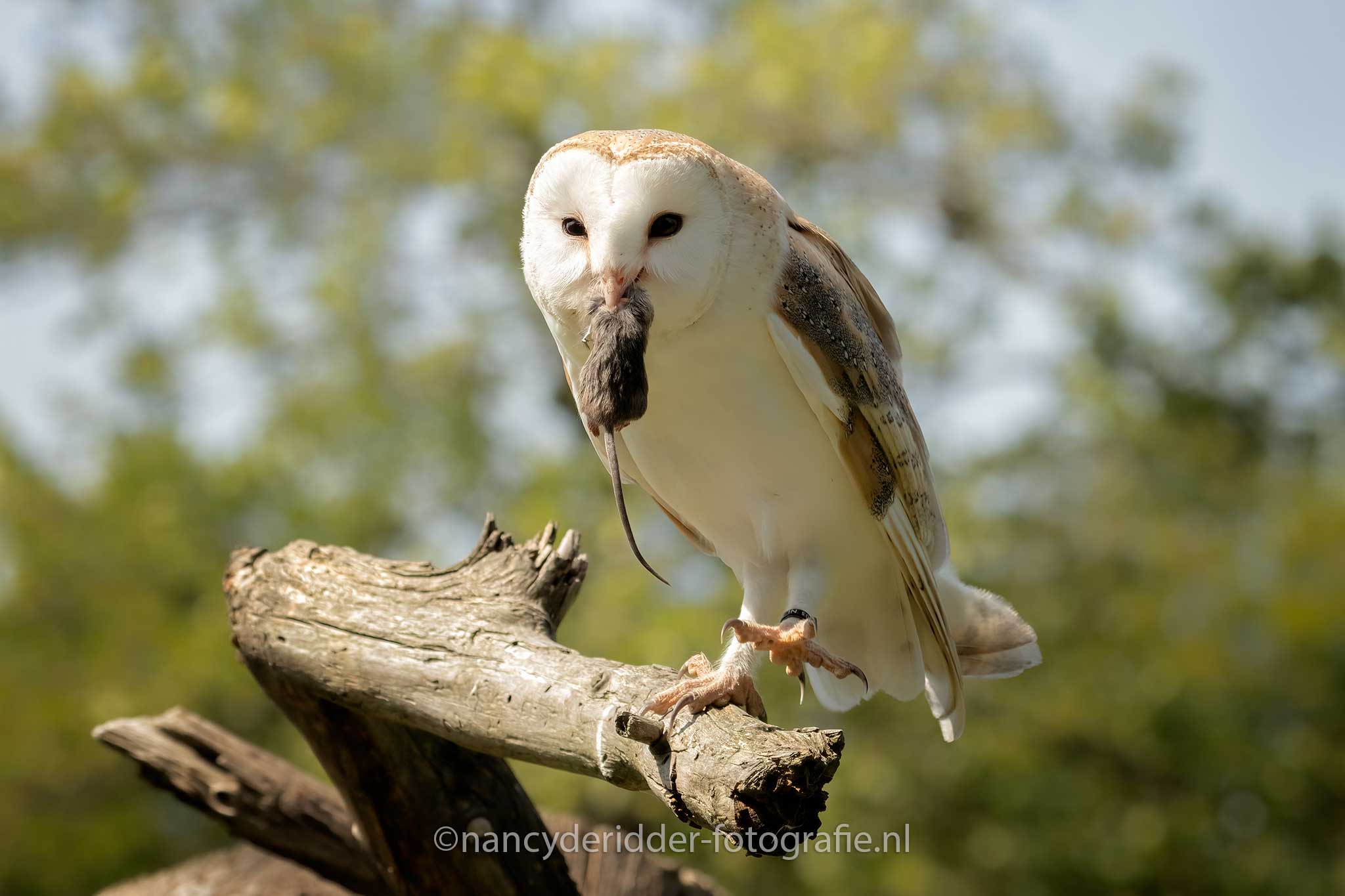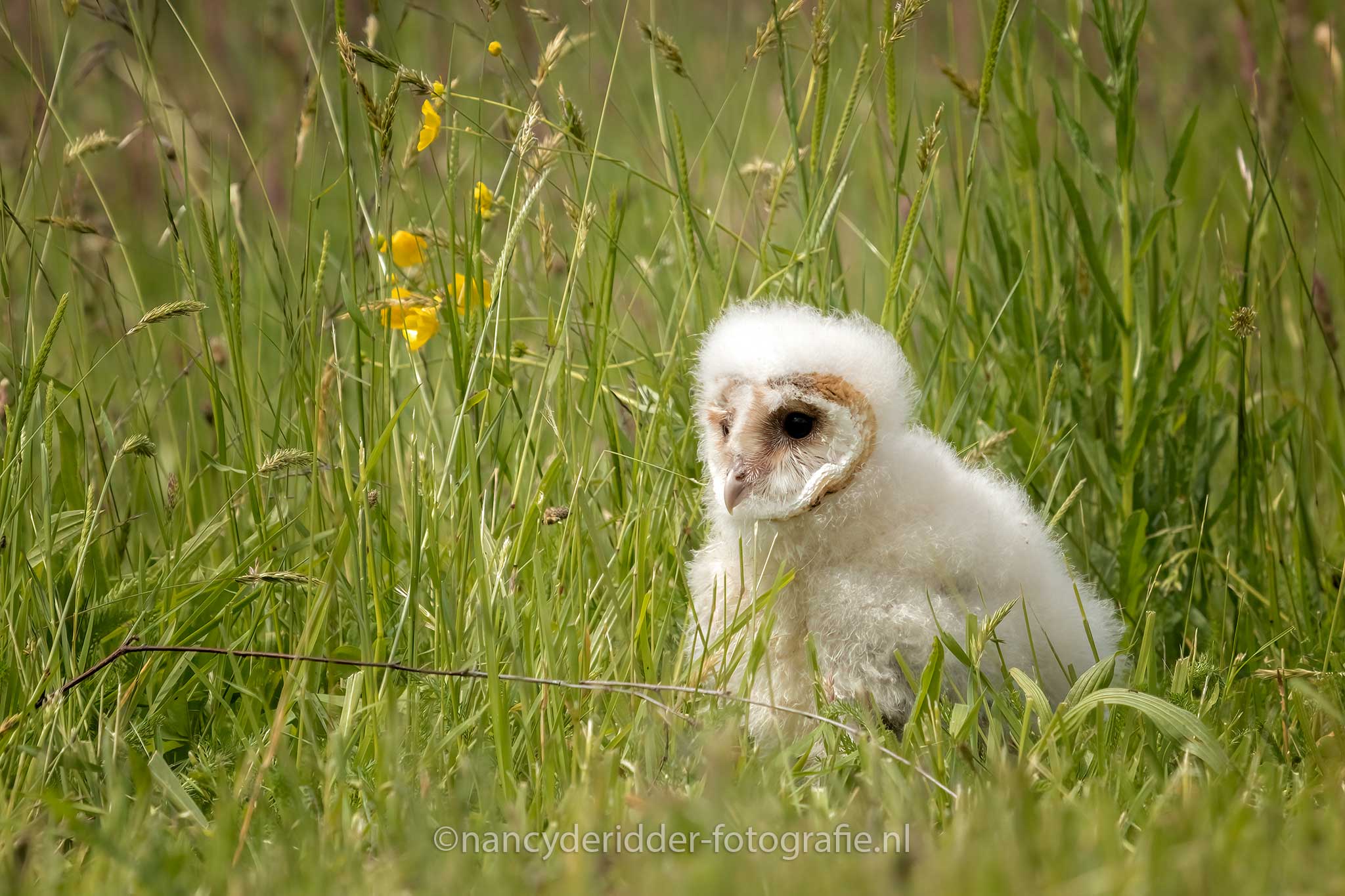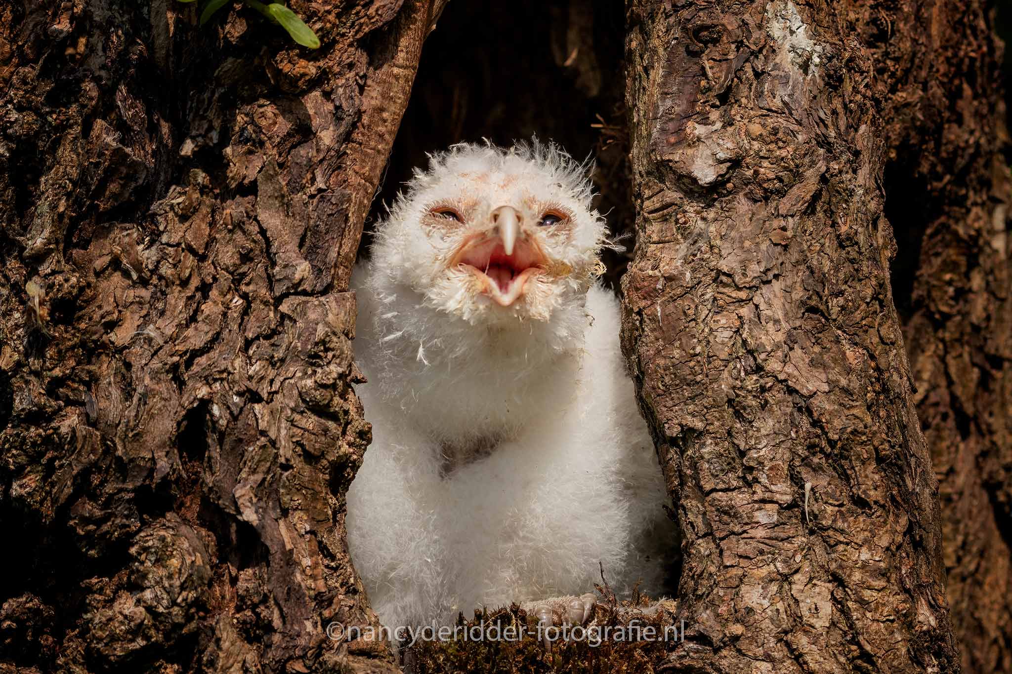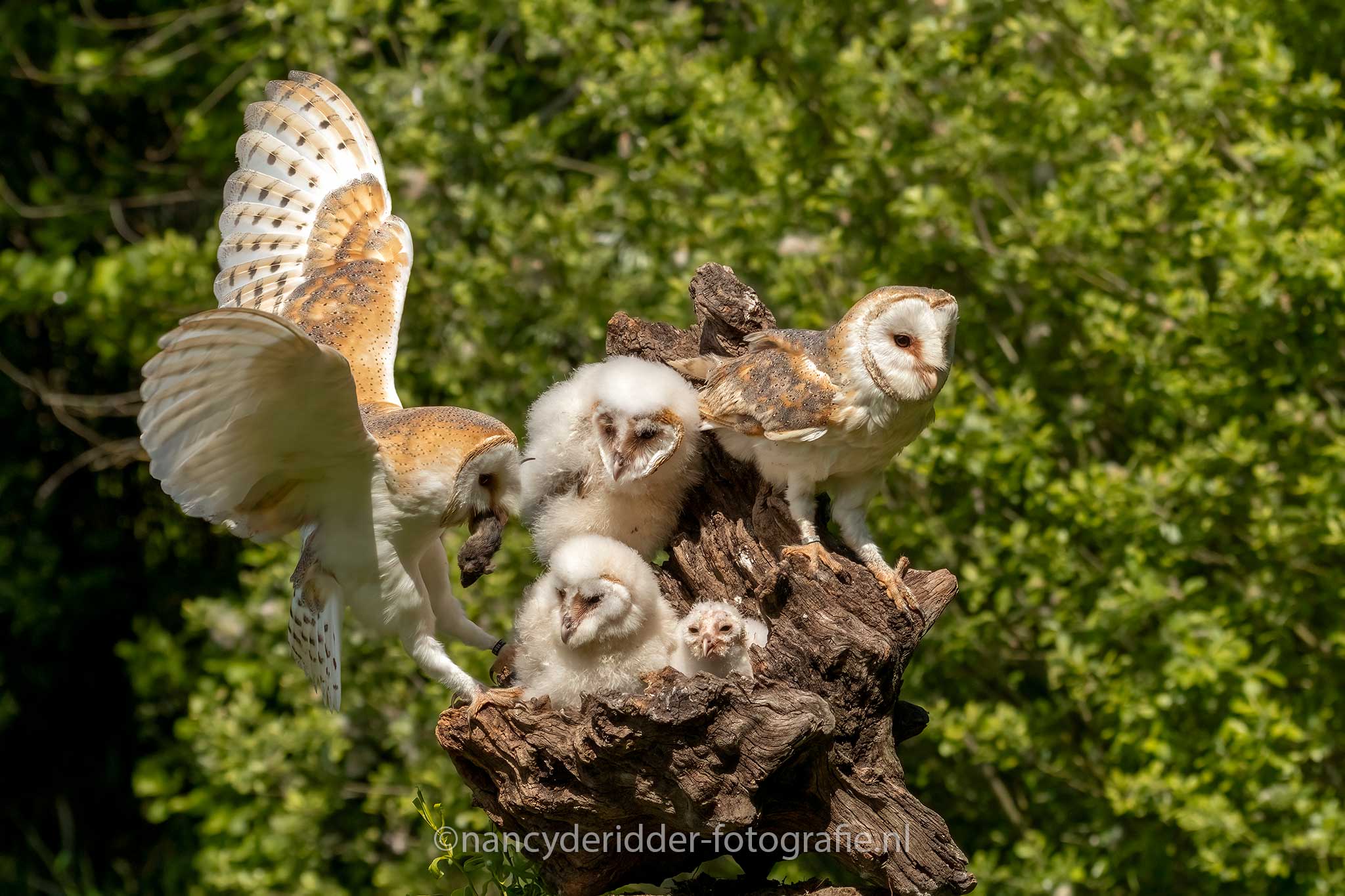 Aangekomen op de locatie stonden daar nog wat fotografen te wachten tot de poort open ging en wij naar binnen mochten. Een groepje van 8 fotografen is heel goed te doen en lopen we elkaar ook niet in de weg. Eenmaal binnen stond daar al gelijk een boomstronk waar dus 3 jonge kerkuilen op ons zaten te wachten, wat een schatjes zeg. Drie witte donzige pakketjes op een boomstronk, snel de camera uitpakken. Al snel kwam moeders erbij, want ja niemand laat zijn kinderen alleen natuurlijk toch?
