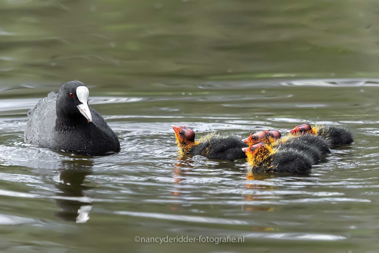 Mama meerkoet lijkt de jonge meerkoetjes hier wat duidelijk te maken. Er wordt aandachtig geluisterd door het jonge spul.