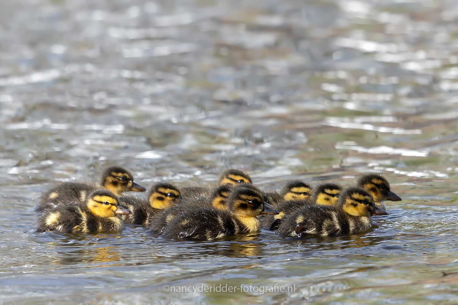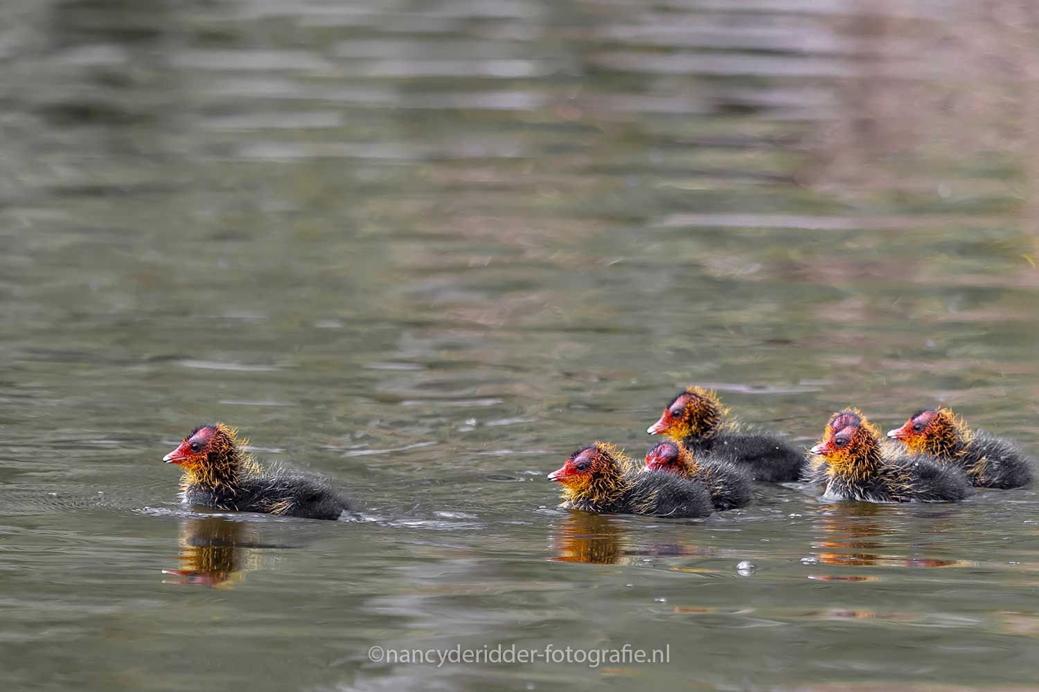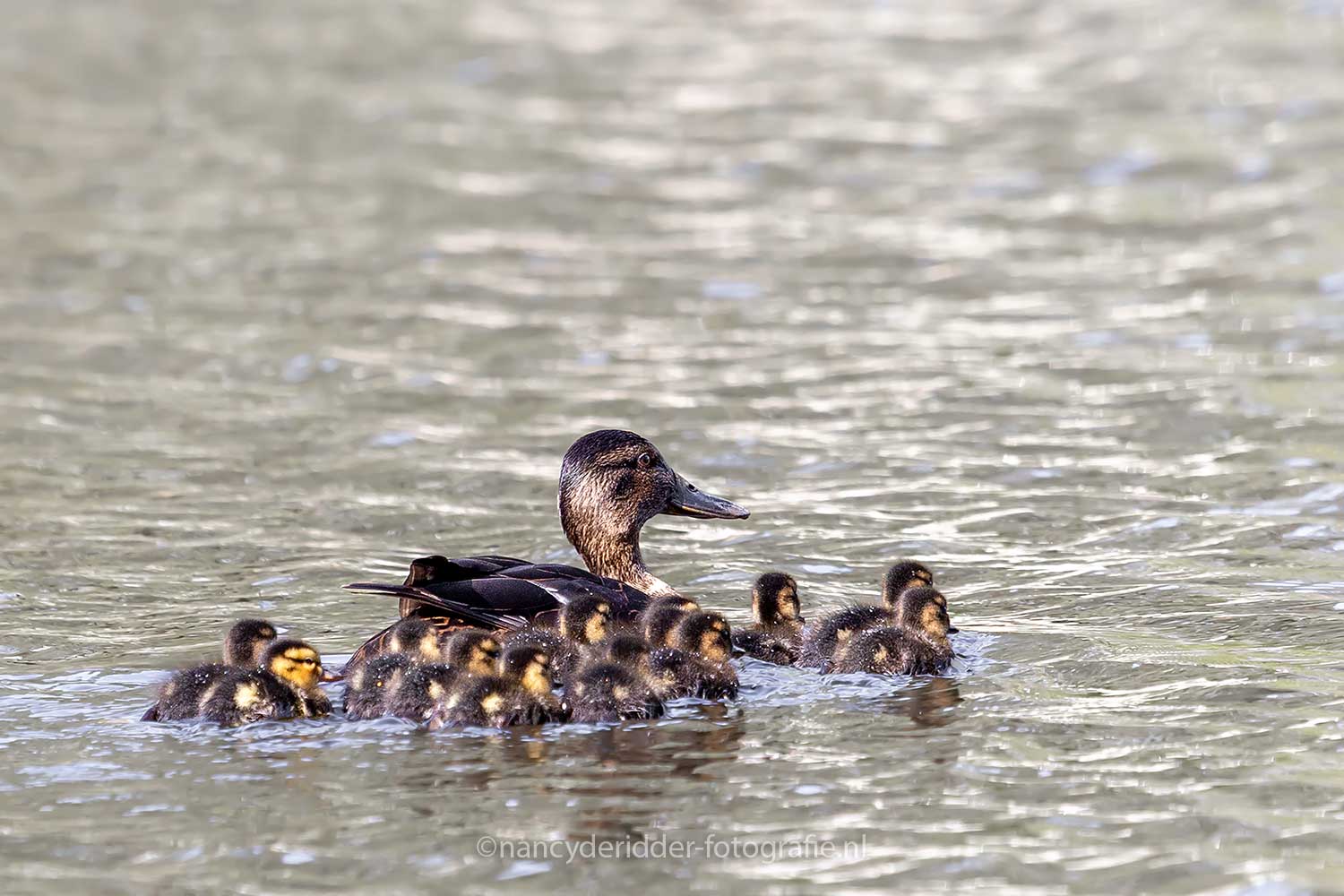 De kuikens vinden het best spannend en blijven dichtbij mama. Ze glijden geruisloos door het water.