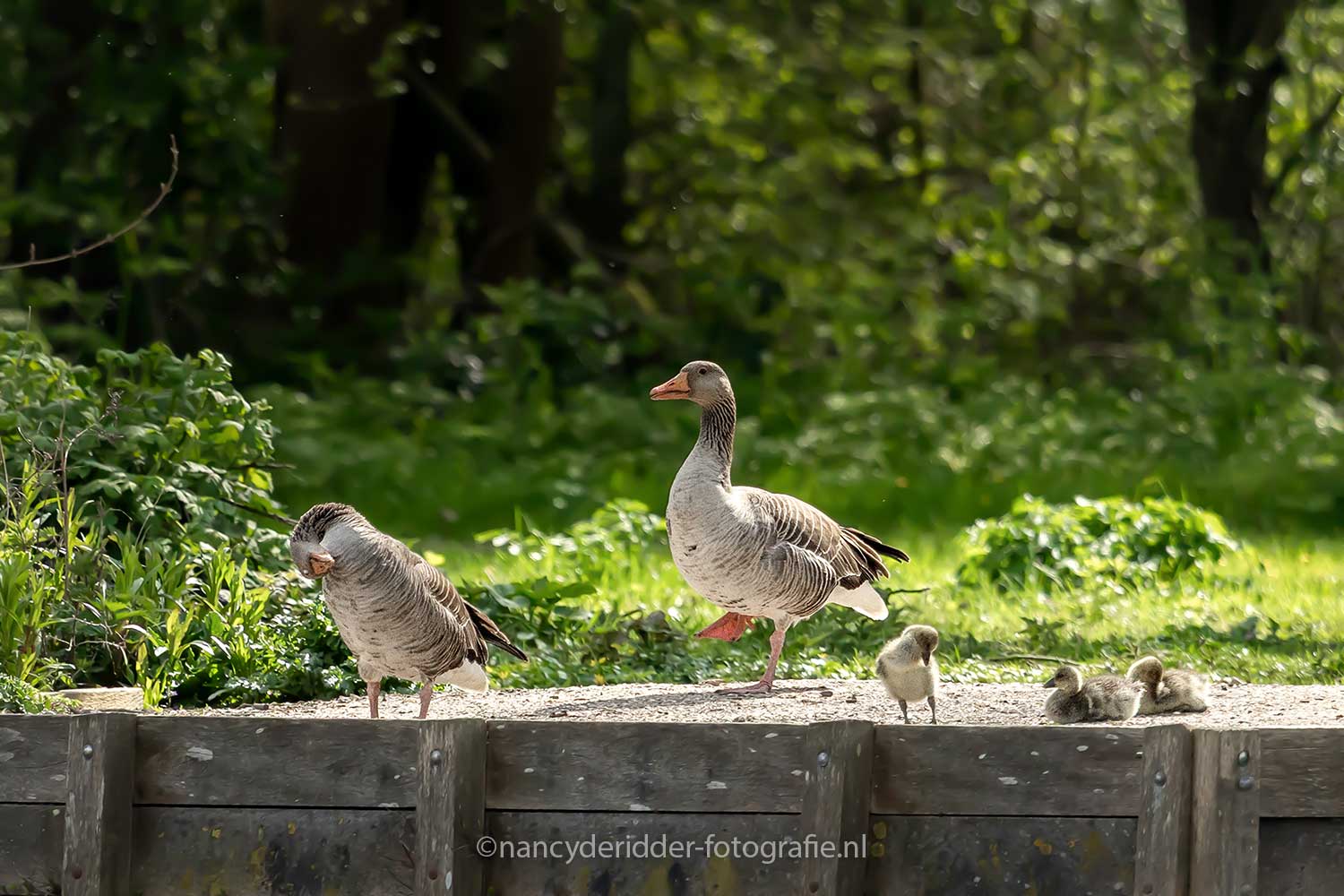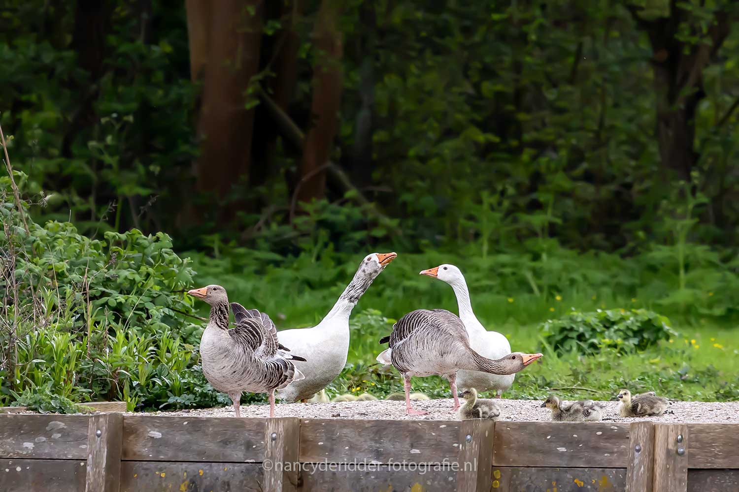 Ik kijk door mijn camera en zoom in. Ja hoor…. kleine ganzenpulletjes op de kant, veilig tussen papa en mama.