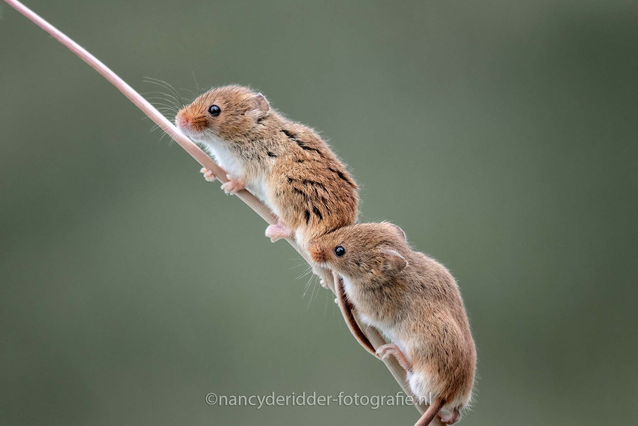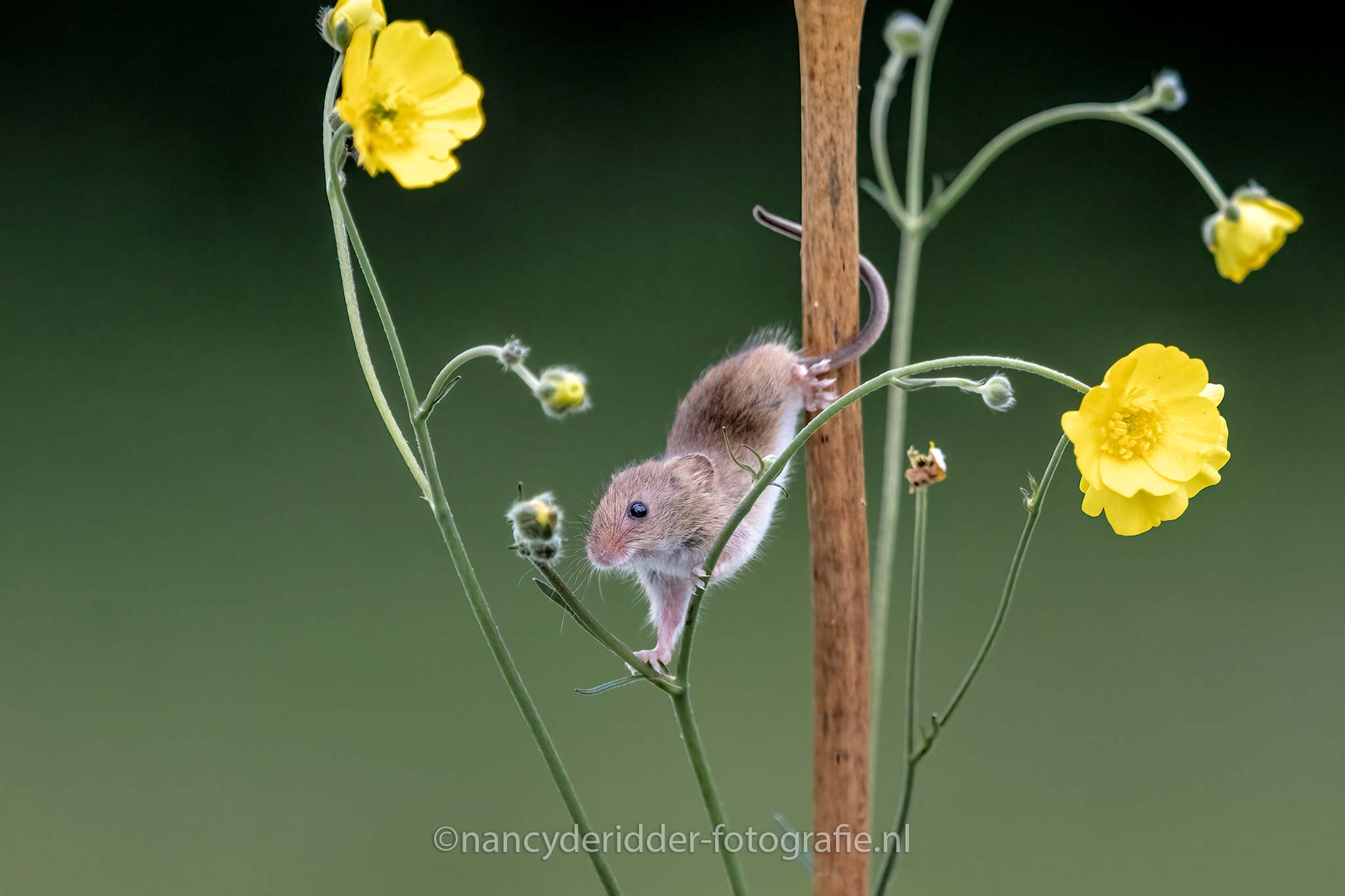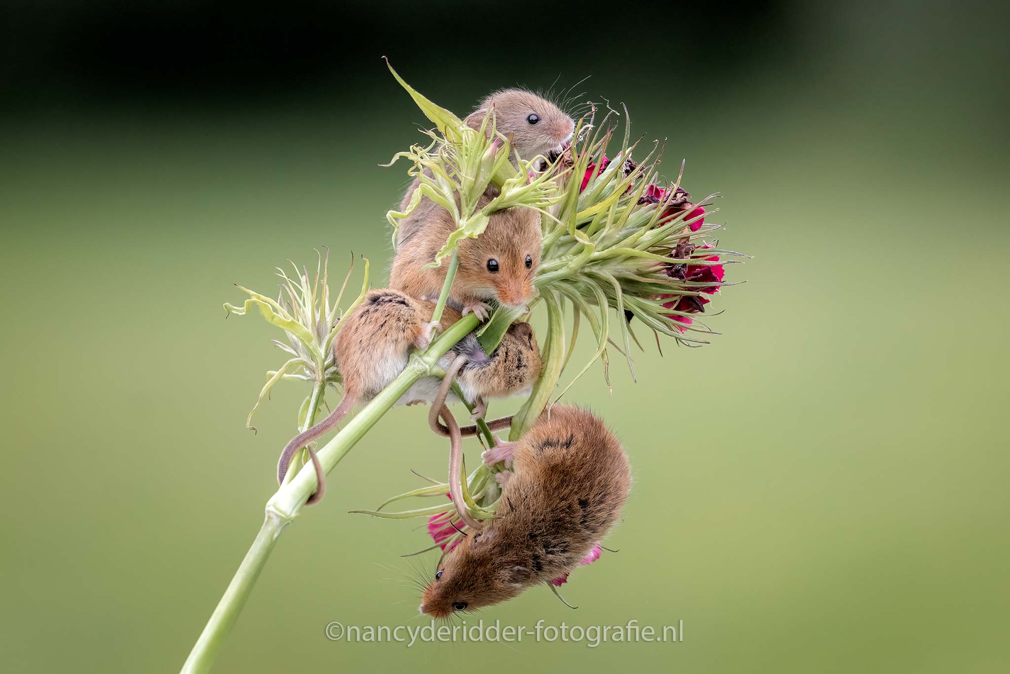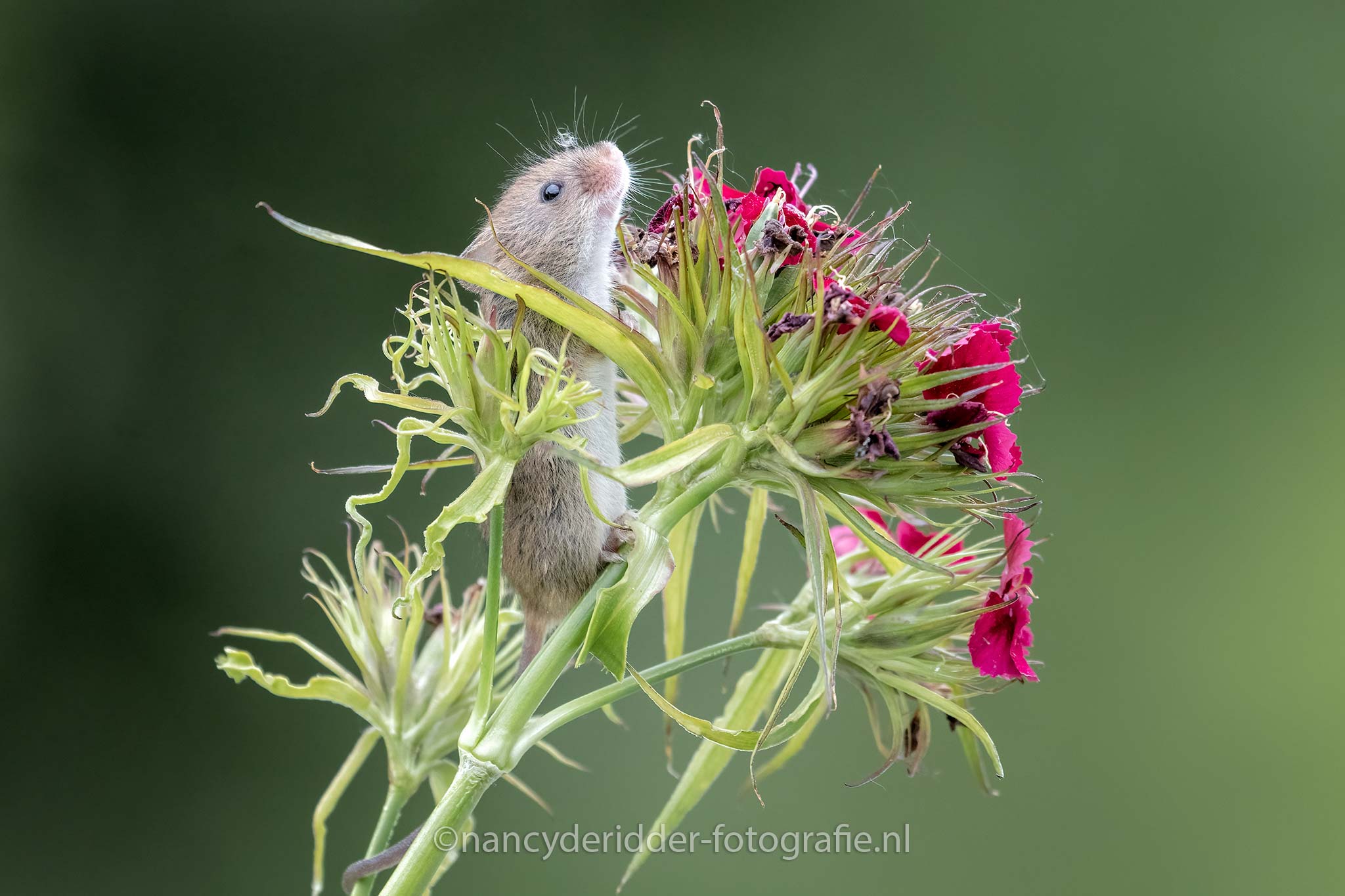 Om de zoveel tijd komt Dean met een andere bloem/tak aanzetten en trekt zich dan weer terug. Ik had geluk, de muizen waren net zo enthousiast als ik dus heb echt mega veel foto’s mogen maken. Soms klommen ze omhoog, vaker maakte ze een schijnbeweging en gingen ze weer terug de steel af naar beneden. Wat een ervaring en wat een lol heb ik gehad om die kleine dwergmuizen, en wat een liefde straalt eraf van Dean voor zijn muizen. Niks geen gestress, gewoon go with the flow…..