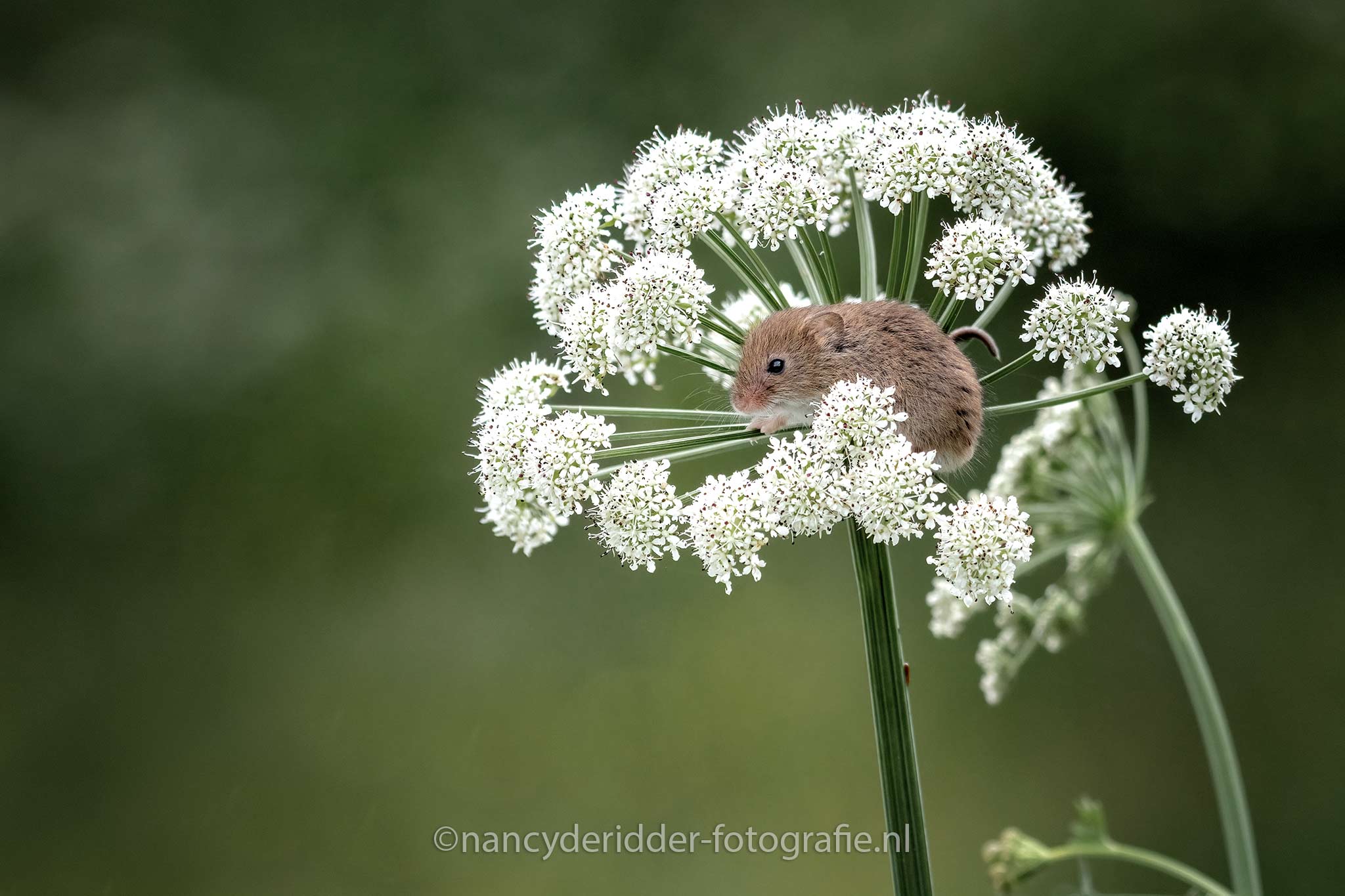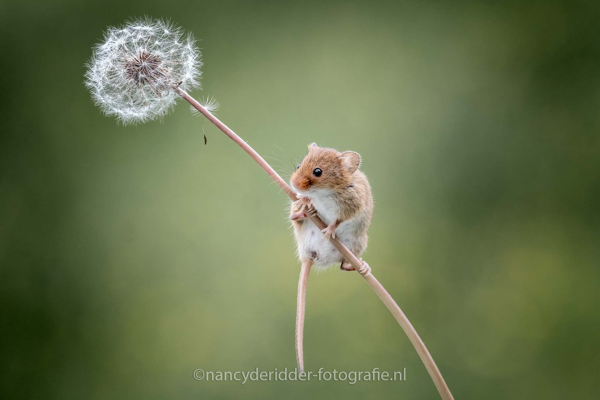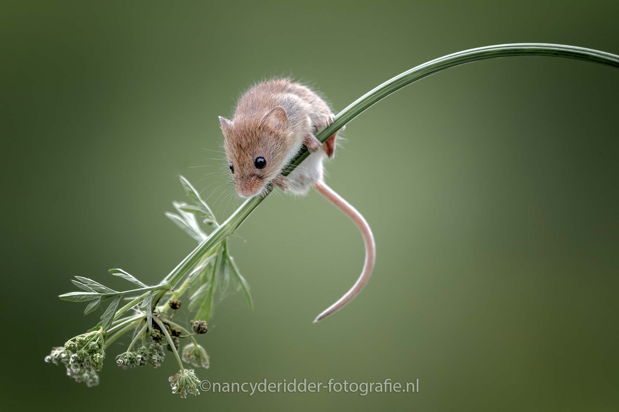 Dwergmuisjes wegen niet zo zwaar, maar net zwaar genoeg om de tak van een bloem om te laten buigen. Het muisje weet overigens keurig zijn balans te houden en valt er niet vanaf.