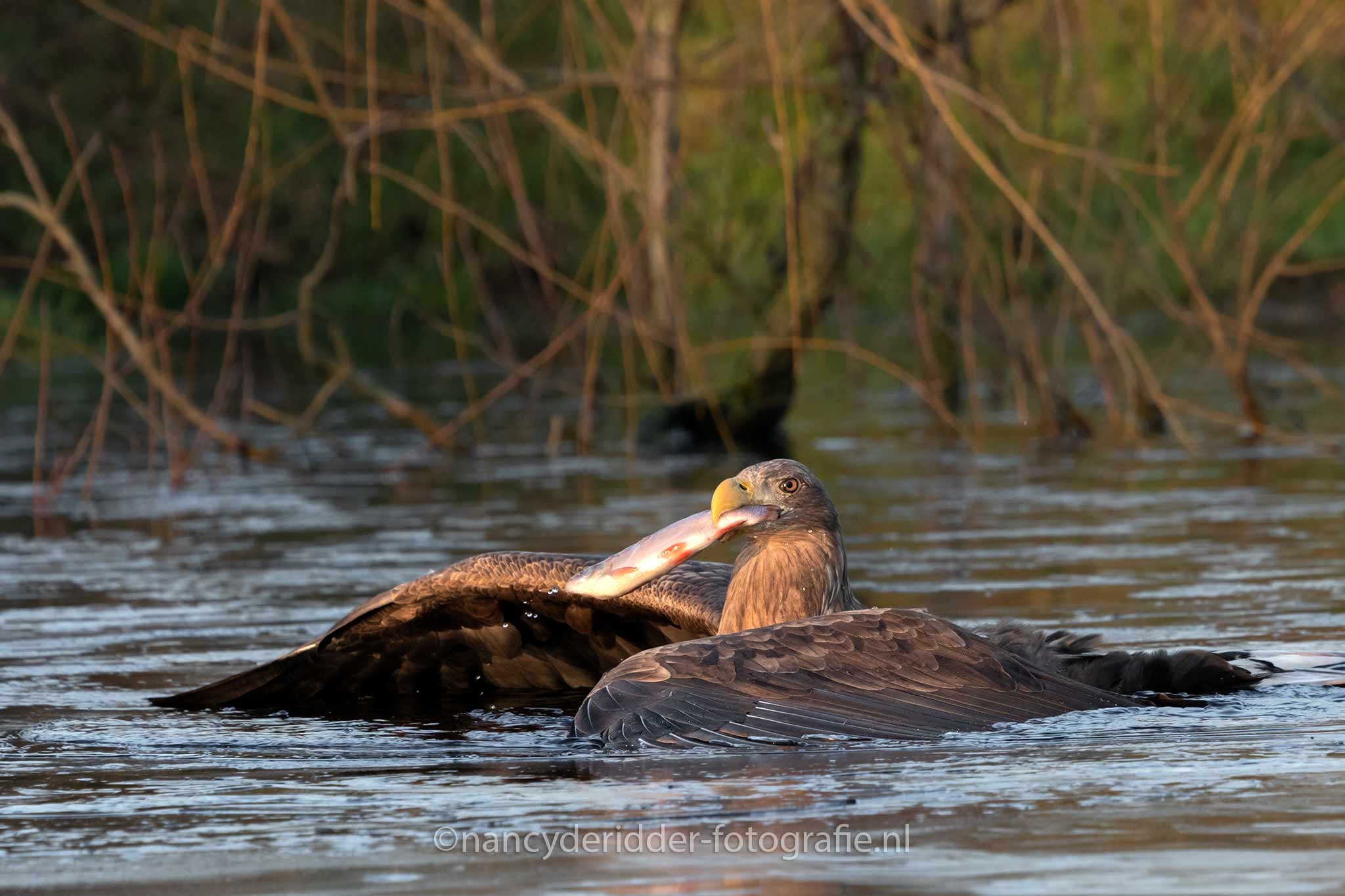 Gevolg …. het schatje zakje met zijn poten door het ijs. Ik kan je vertellen dat ik mij rot schrok, maar iedereen bleef kalm en de zeearend baande zich, met zijn grote vleugels slaande, een weg naar het droge alwaar hij alsnog heerlijk genoot van zijn gevangen vis.