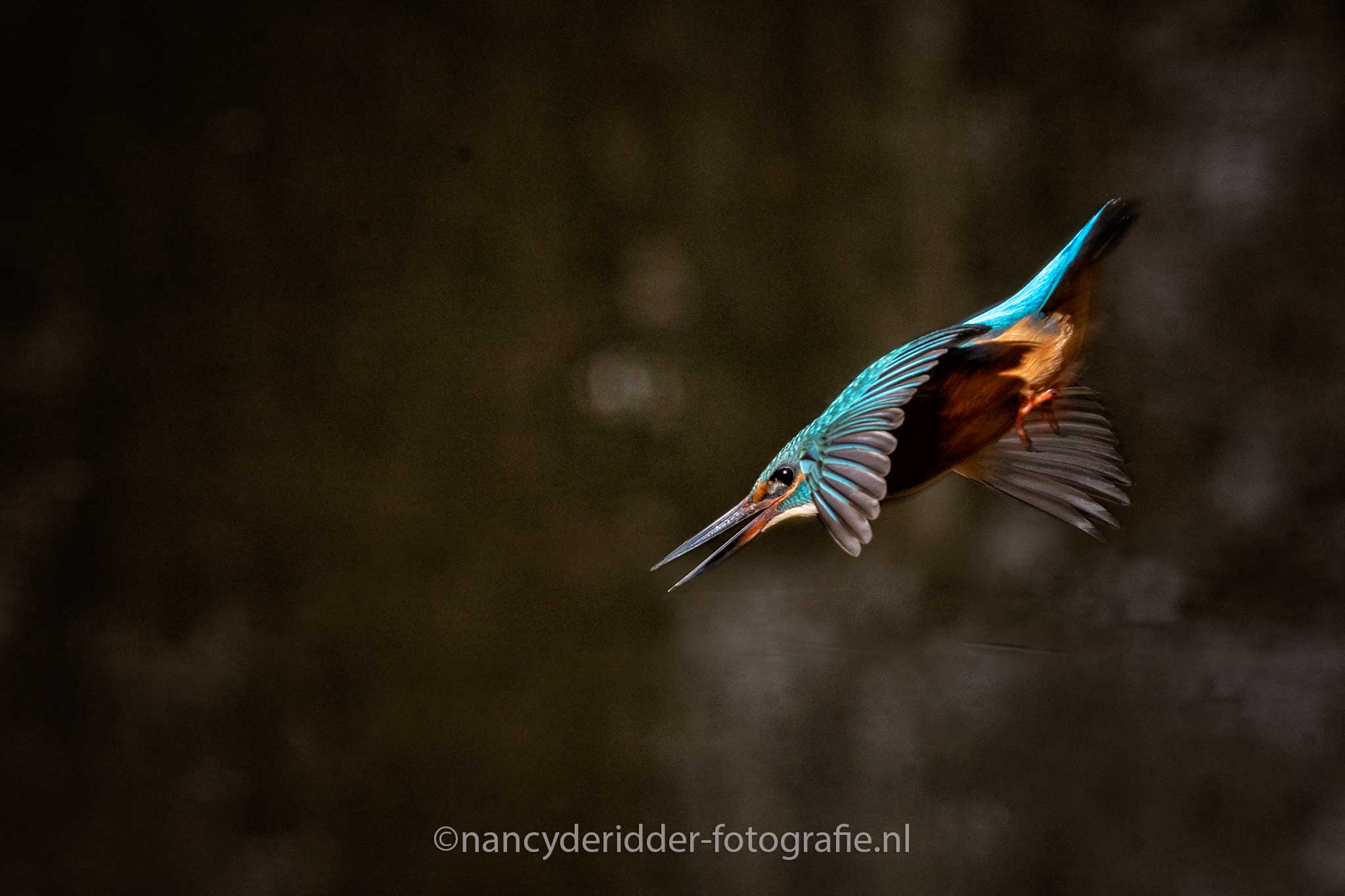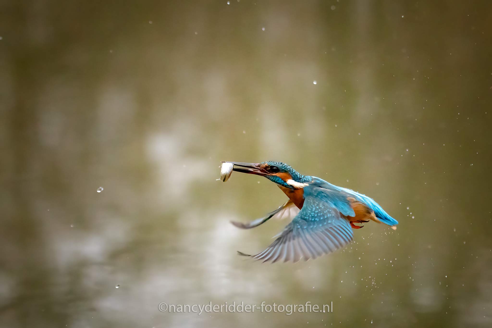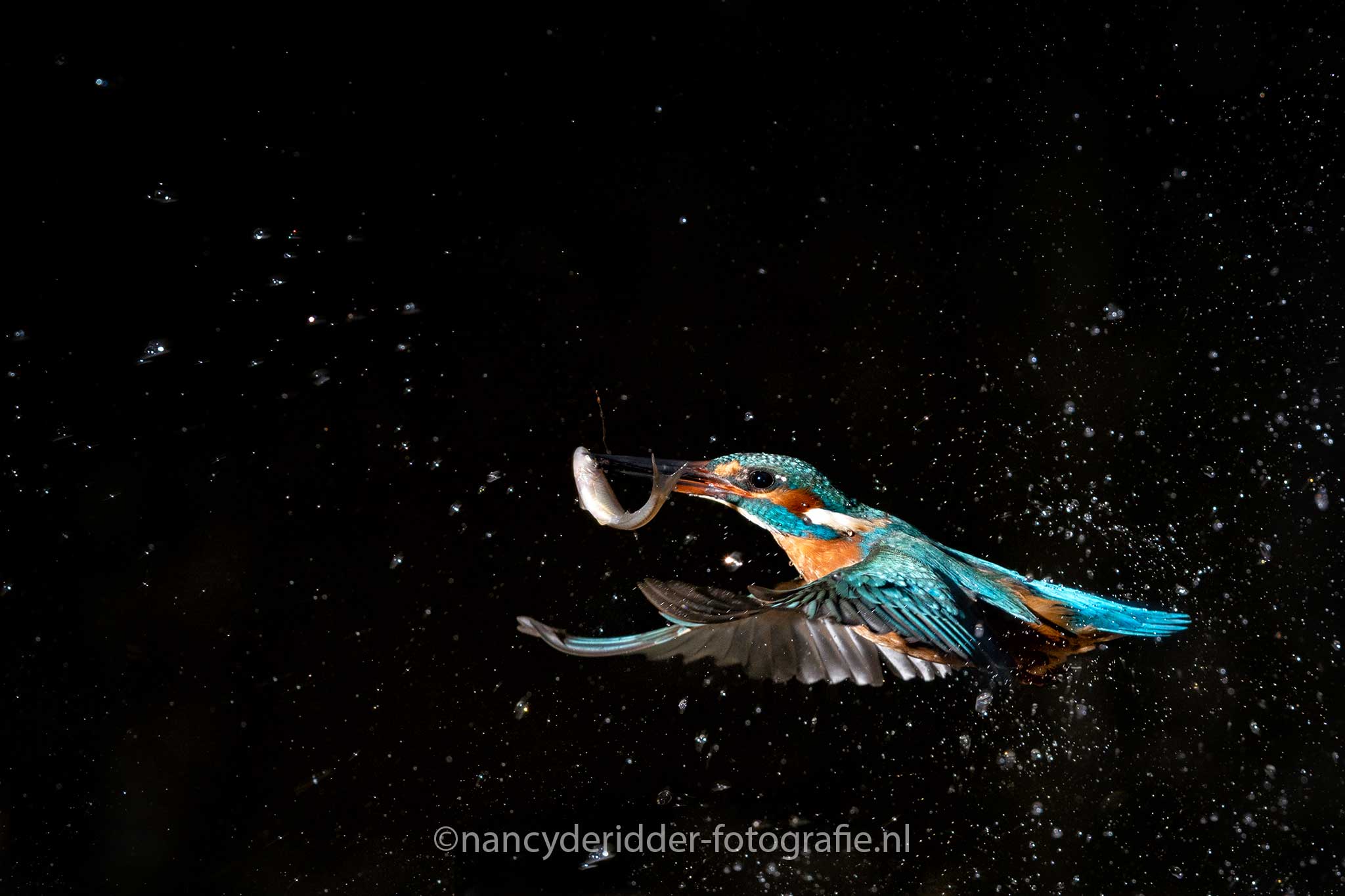 Geweldig om deze foto te mogen maken. Deze is gemaakt met behulp van een externe flitslamp. De ijsvogel lijkt wel trots te zijn op de gevangen visje en vliegt vol trots naar een plekje om ervan te genieten.