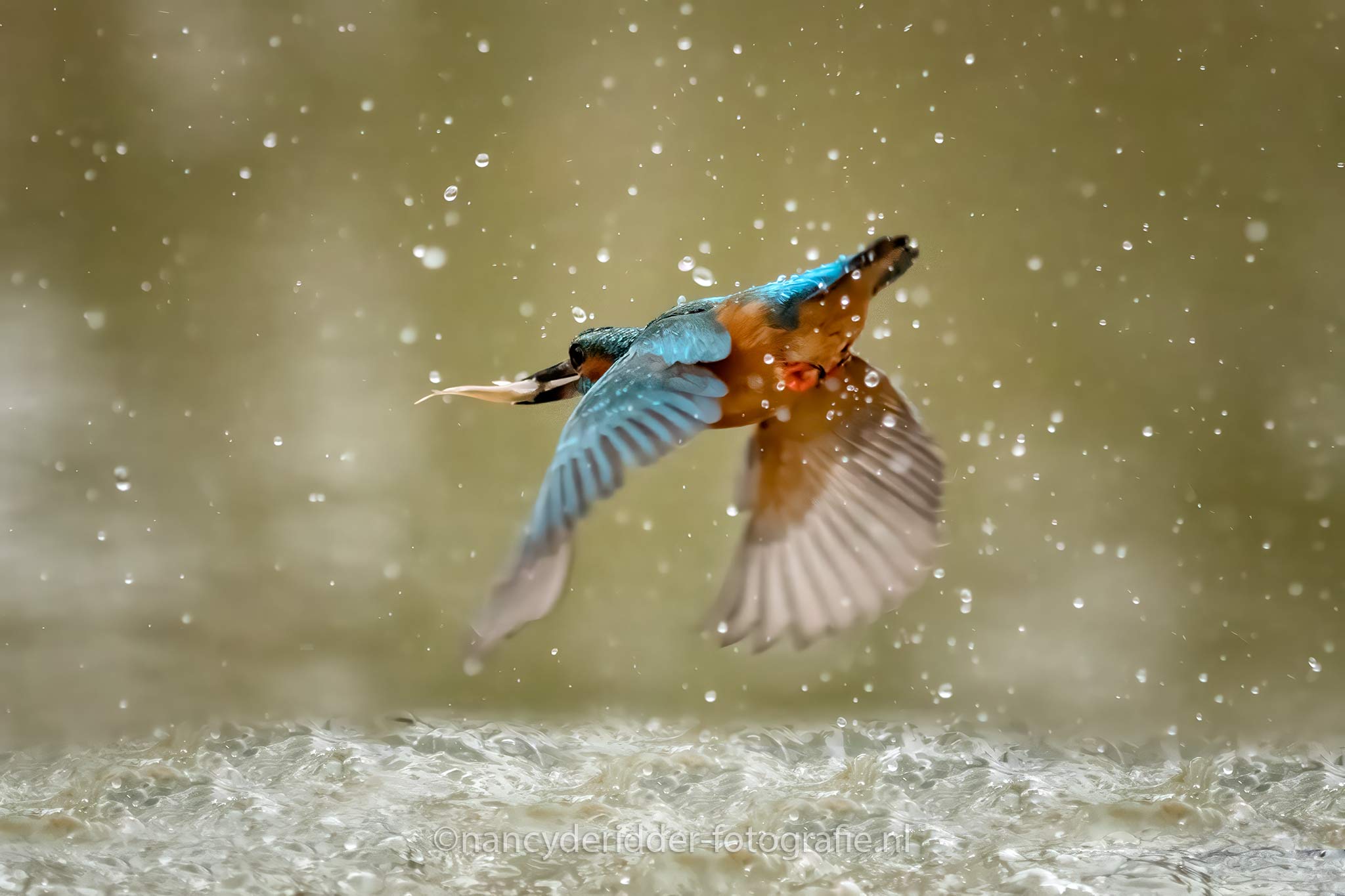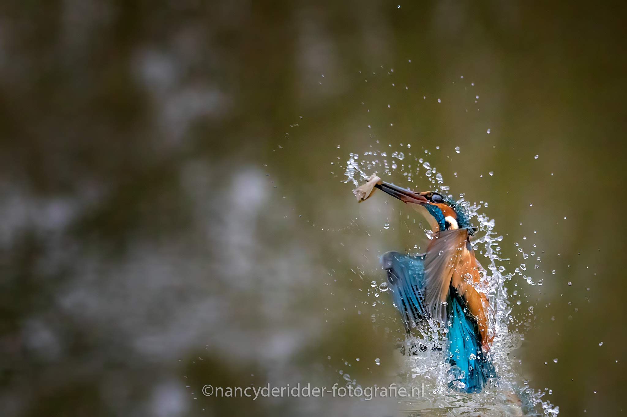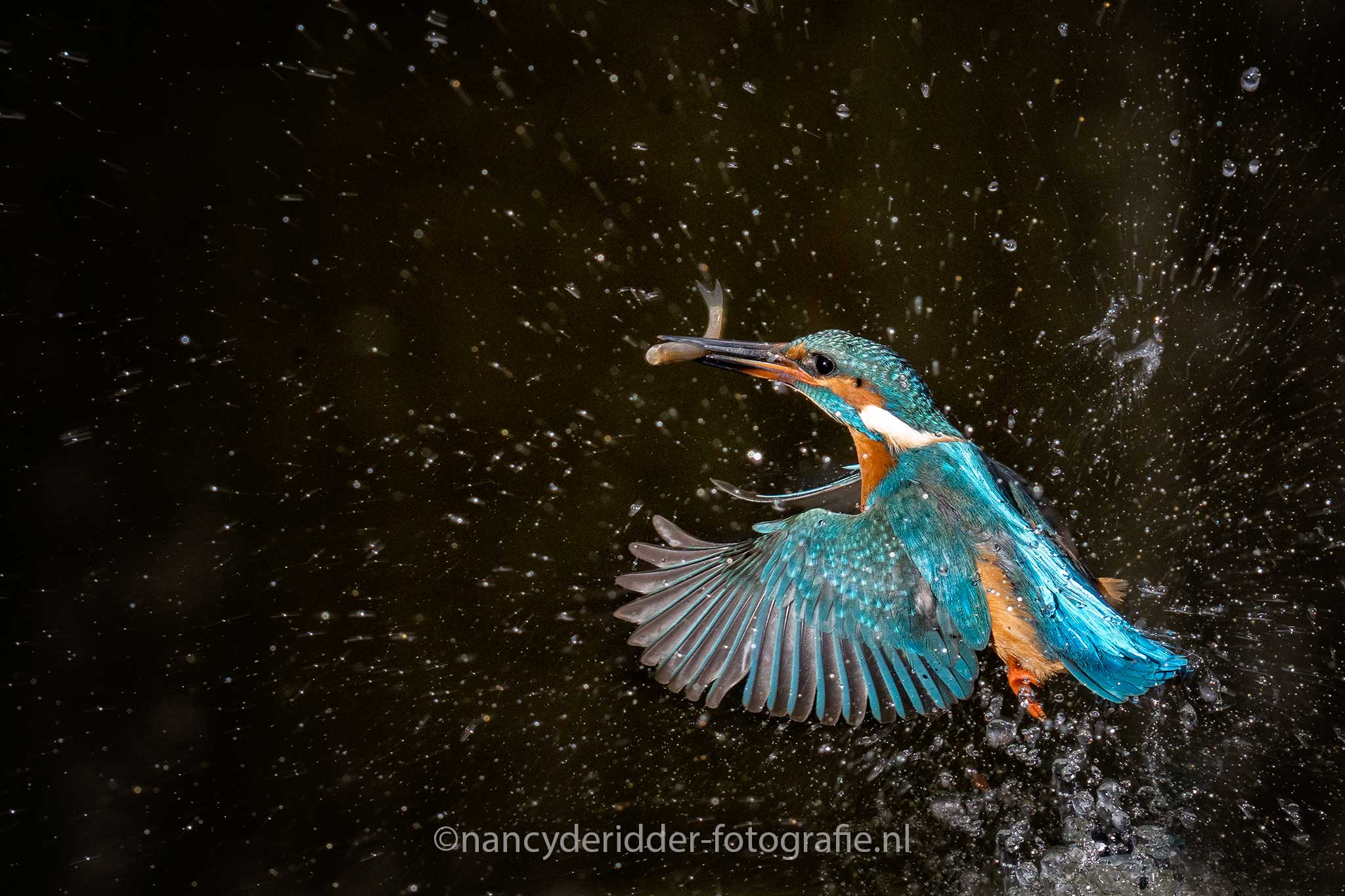 Hier komt de ijsvogel net uit het water met een vers gevangen visje. De spetters vliegen om de ijsvogel heen, wat een spettergeweld.
