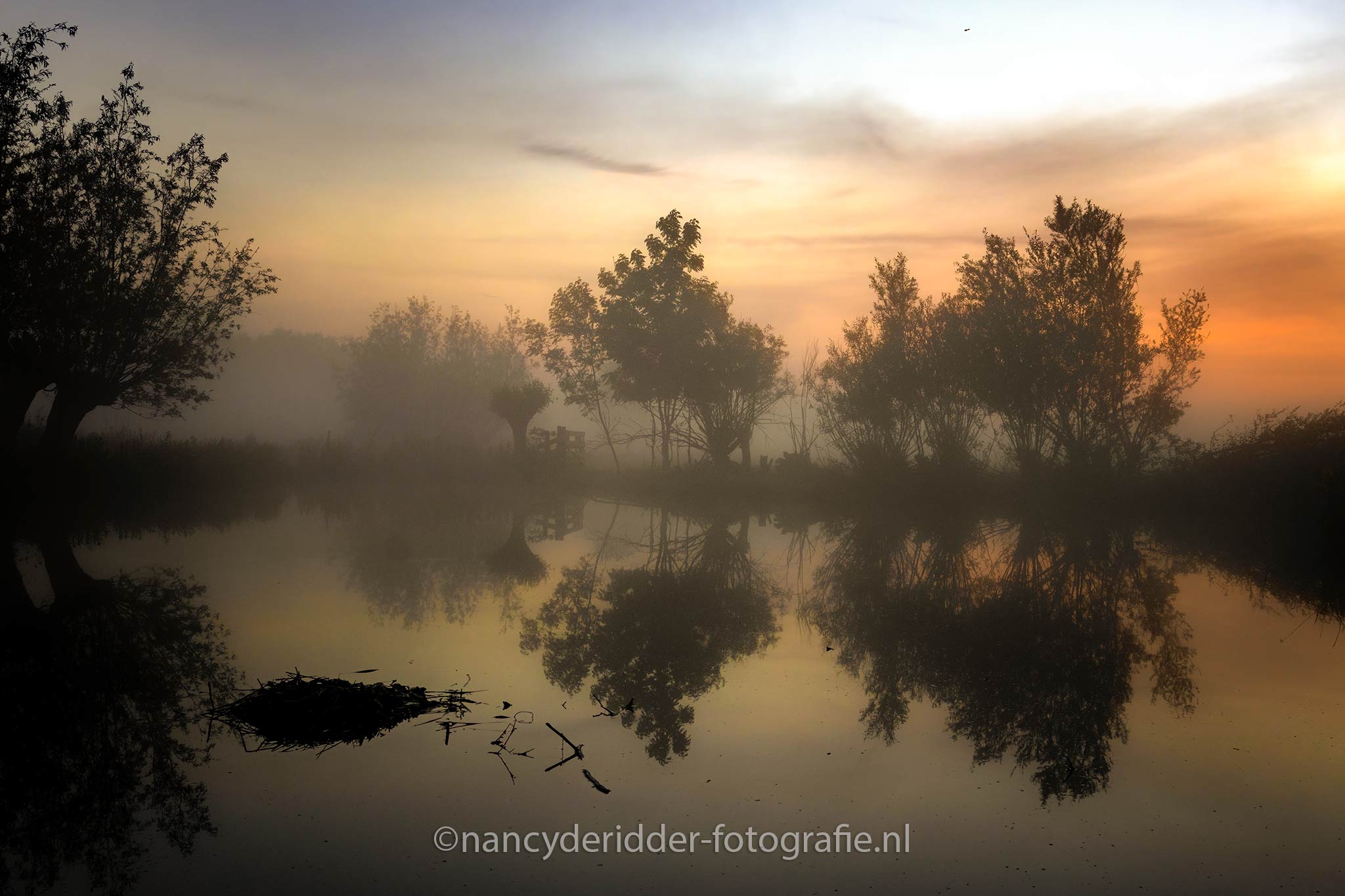 De rit ging naar Gouderak, en op 1 van de vele polderweggetjes stopte we. Dit was the place to be. En dat was het dan ook echt, de koeien in het gras….hier en daar een leuk houten hek….een watertje en niet te vergeten….de grondmist.