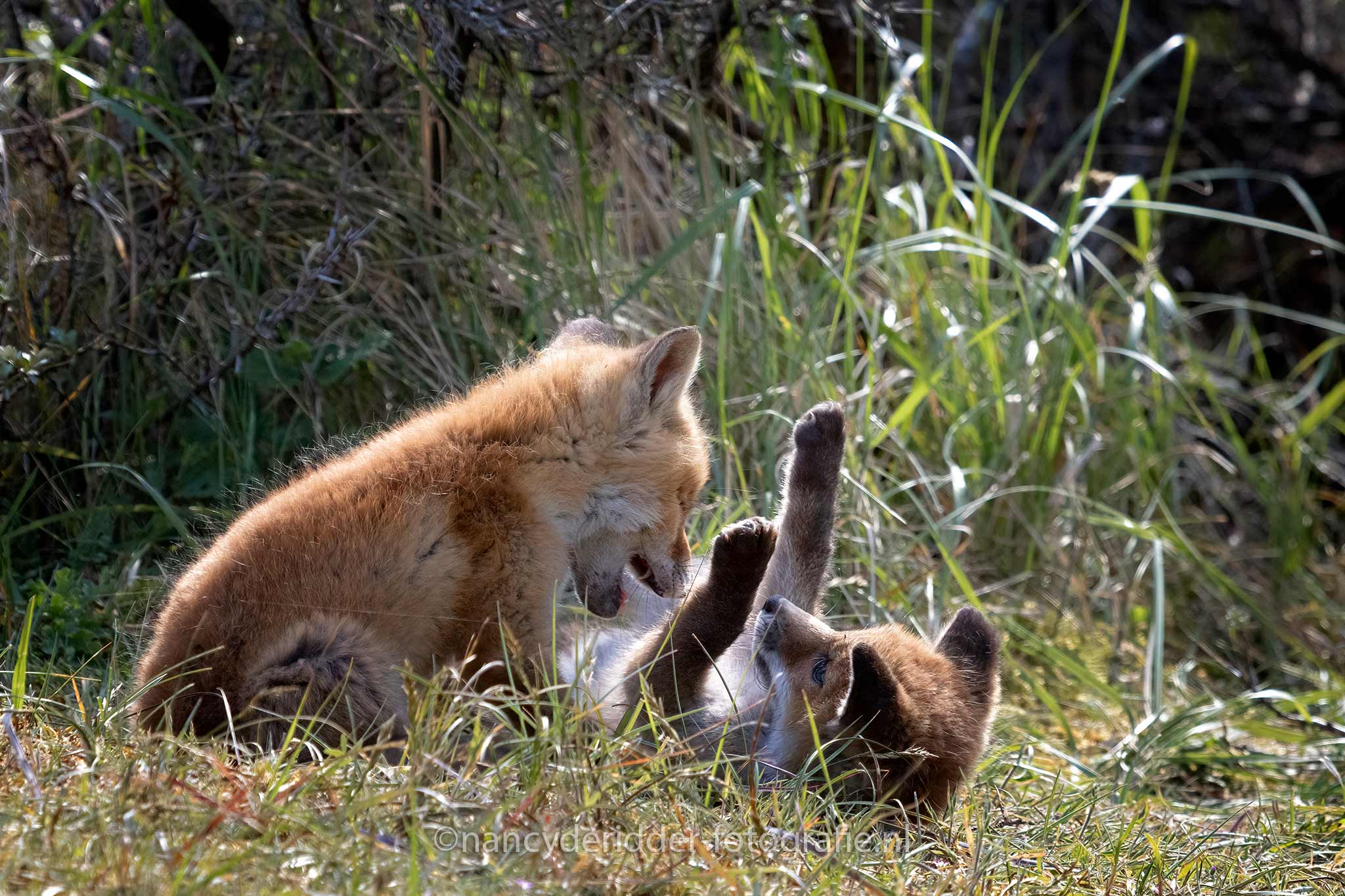 Hoewel 1 van kleine vosjes al op pad wilde dacht de ander daar heel anders over. Hij was tenslotte net wakker gemaakt door zijn broer en wilde nog even spelen. De wijde wereld trok hem blijkbaar minder, hij had genoeg aan zijn broertje, en gooide dan ook zijn pootjes lekker in de lucht tijdens het stoeimomentje.