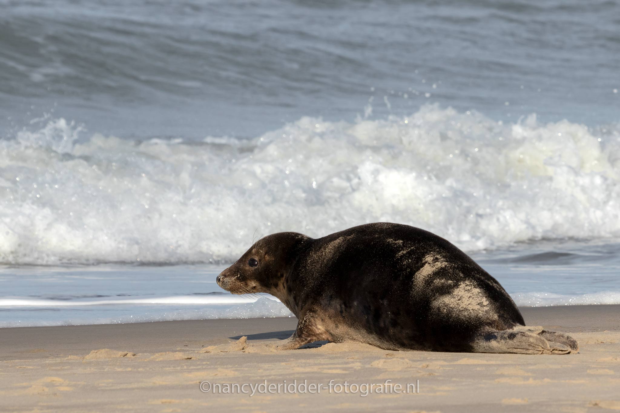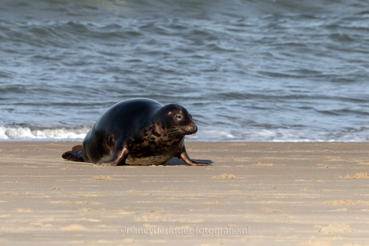 Rond een uur of 12 had ik het wel gezien, helaas moeders was niet te bekennen en ik had het best koud gekregen. Ik was zo dom geweest om mijn handschoenen in de auto te laten liggen. Mijn camera zat net goed en wel in de tas toen er dus enige beweging in het water kwam. En daar was plots moeders ineens. Alert om zich heen kijkend kwam ze uit de zee het strand op.